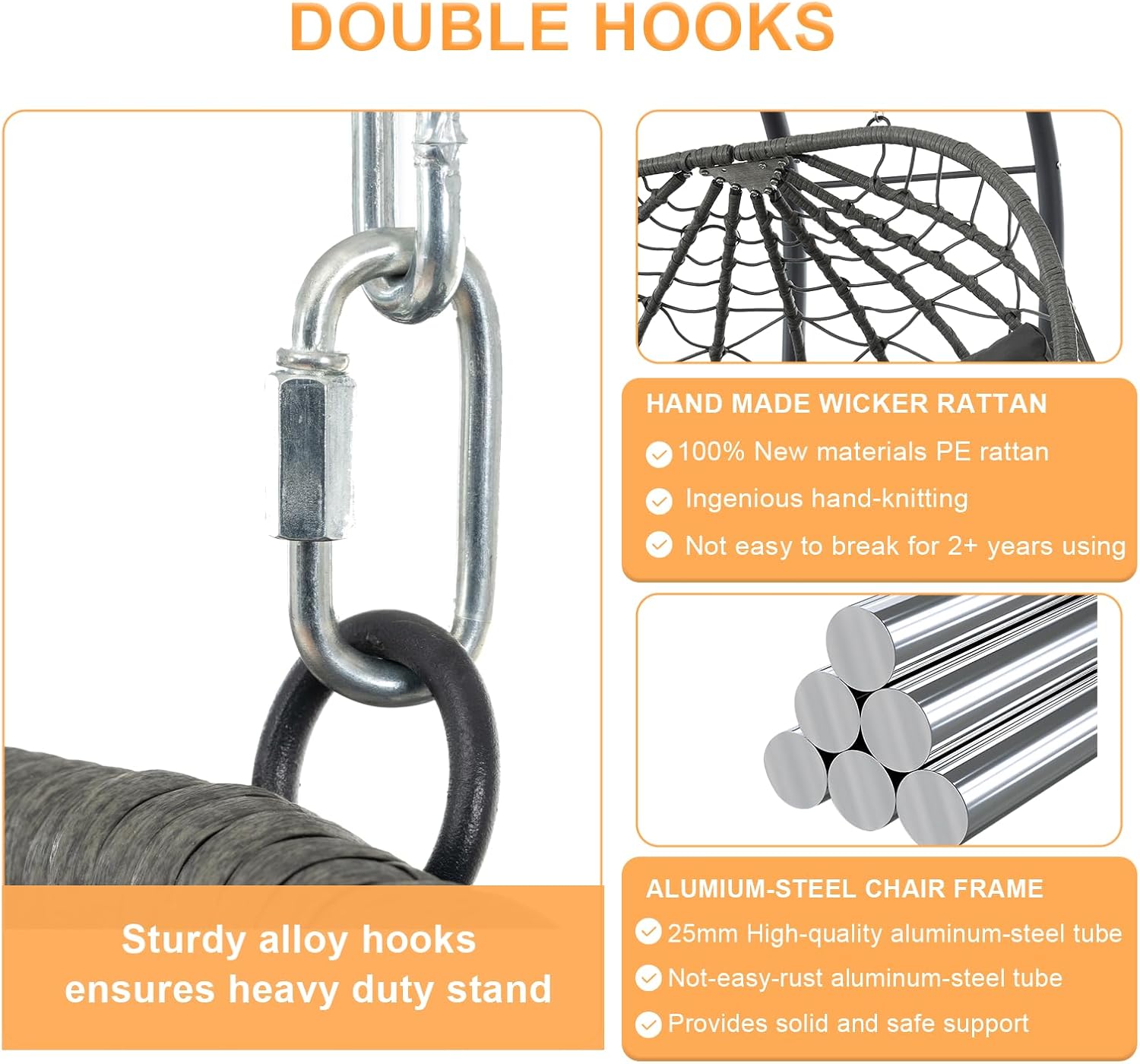 2 Person Double Egg Swing Chair with Stand Indoor Outdoor, Hammock Egg Chair Outdoor, Patio Wicker Hanging Egg Chair w/Cushion 700LBS Capacity for Bedroom, Balcony, Garden, Dark Grey