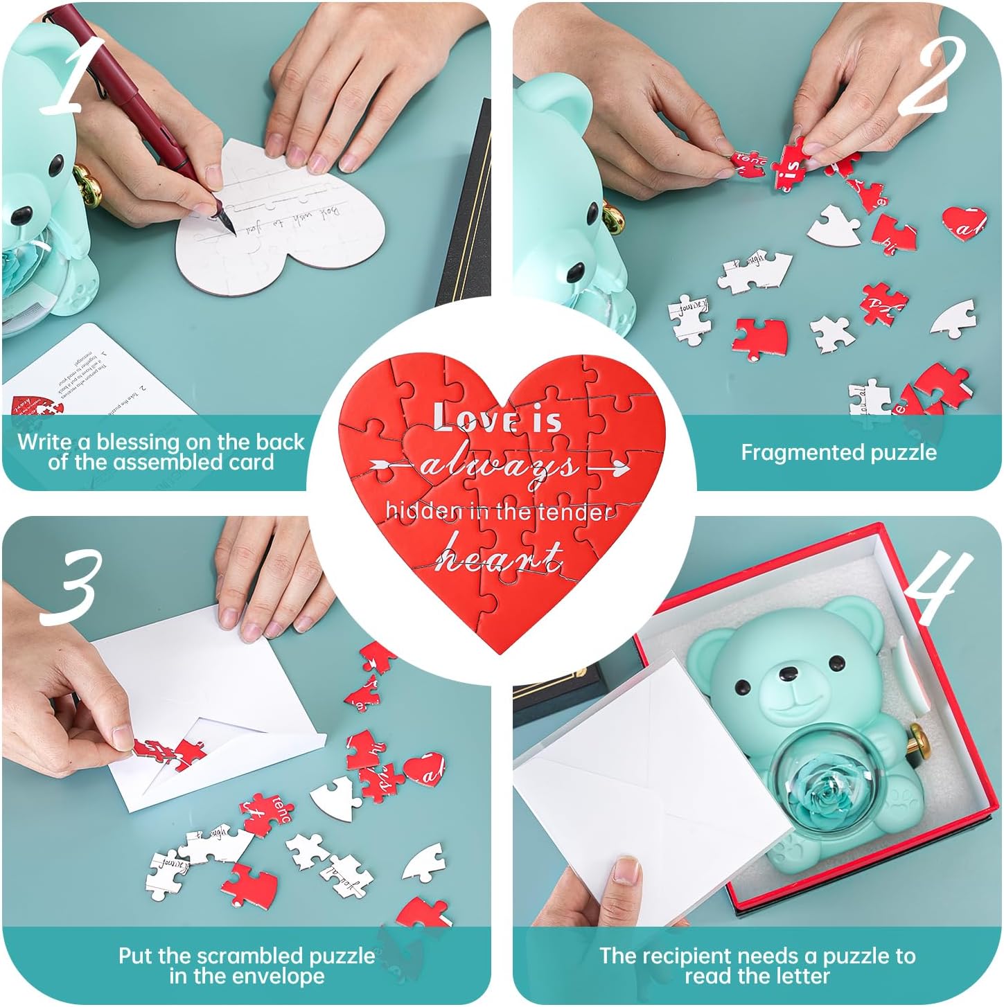 - 🧩 Uniquely Designed Love Puzzle: This special love puzzle allows you to write a heartfelt message on the back. Break up the puzzle and place it in an envelope. For your special someone to understand your feelings, they must piece the puzzle together, revealing your message of love.