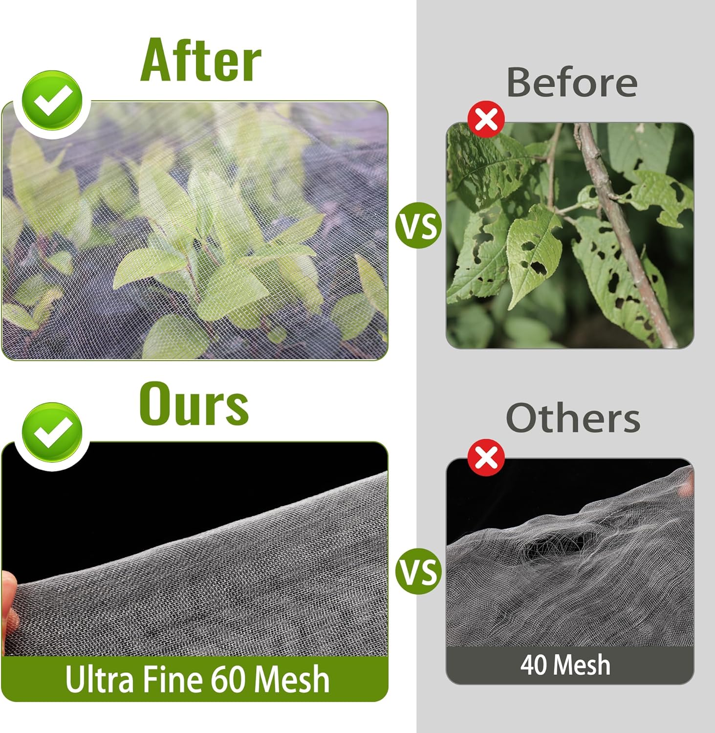 - Ultra Fine Mesh Netting: Constructed of super dense 60 mesh (0.8 mm x 1 mm), plant cover will protect your vegetable and fruit trees away from animals eating like birds, squirrels, rabbits, help you have more and tastier fruits
