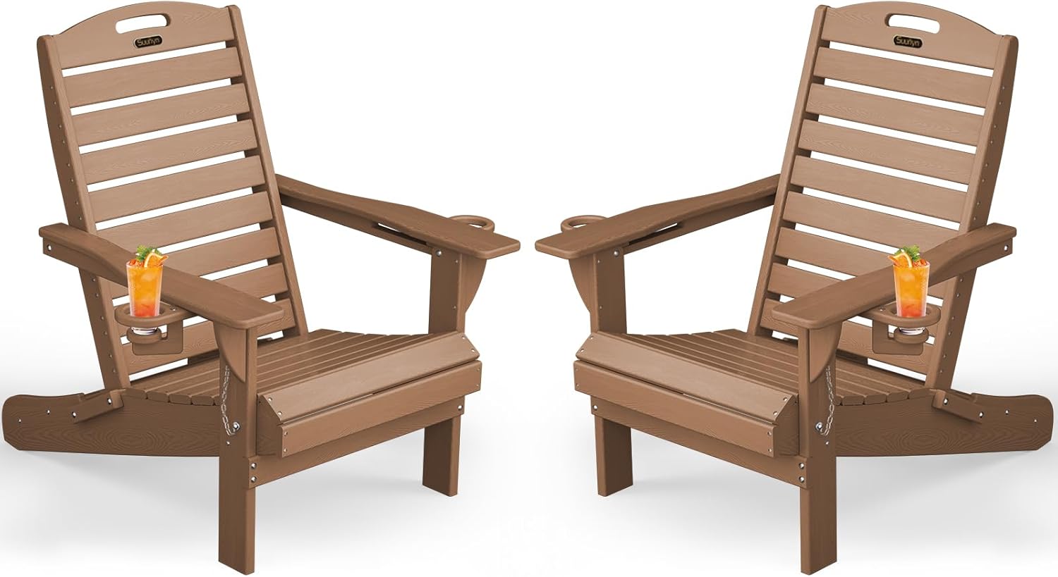 Adirondack Chairs Set of 2, Outdoor Fire Pit Chairs, HDPE All-Weather Adirondack Chairs with Cup Holder, Lawn Chair for Deck, Patio, Garden (Teak)