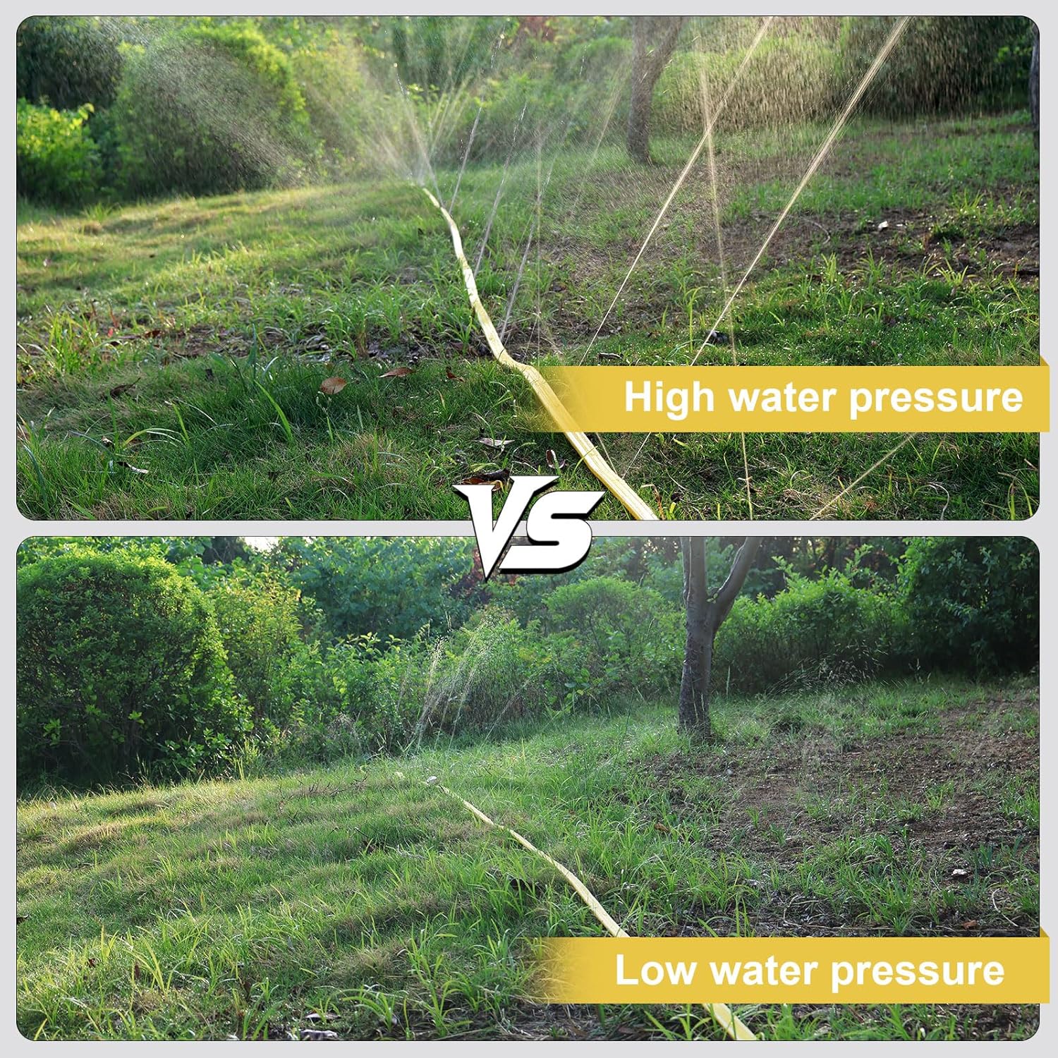 - Innovative Three-Tube Design for Efficient Watering: Featuring a unique three-tube construction and multi-directional holes, this no kink sprinkler hose provides a spray range of 3 to 8 feet for each holes. With operating pressure between 20-65 PSI, it ensures consistent water delivery while conserving water—perfect for small gardens, large lawns, or even sprinkler irrigation system setups.