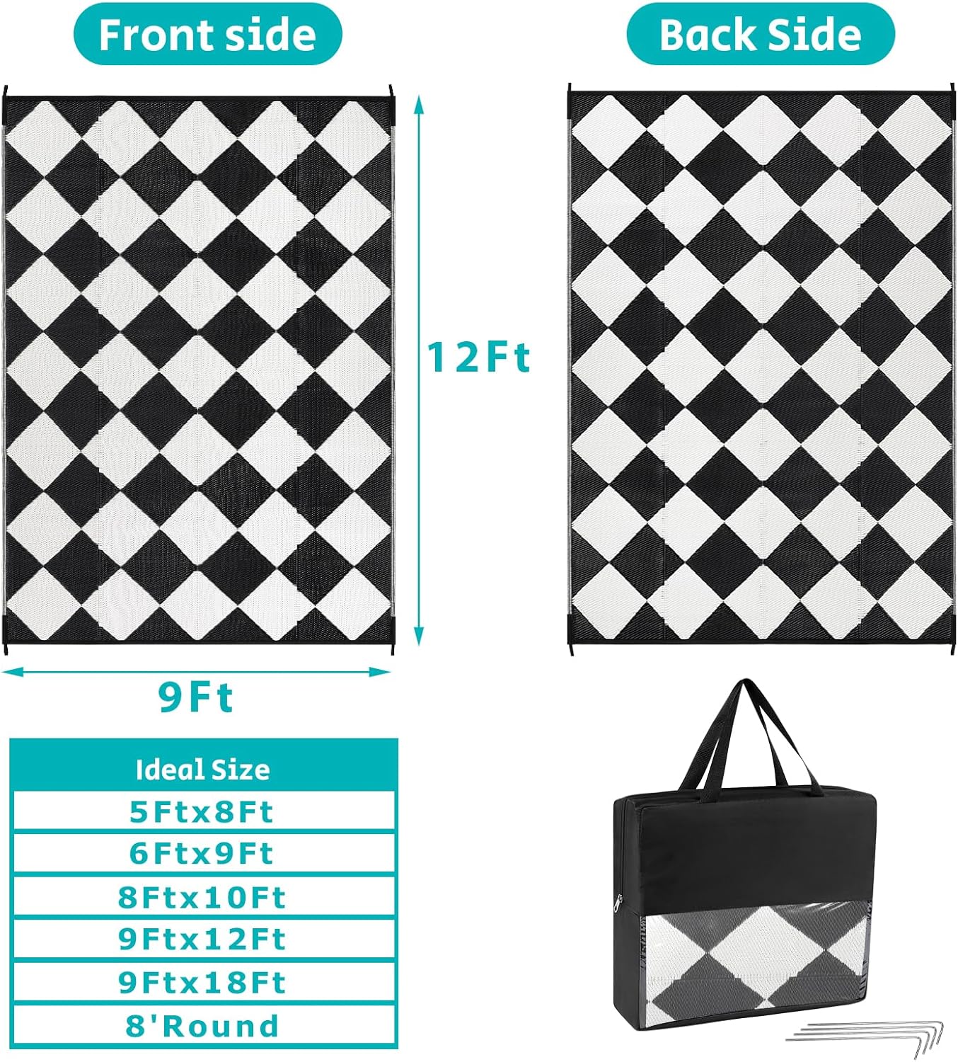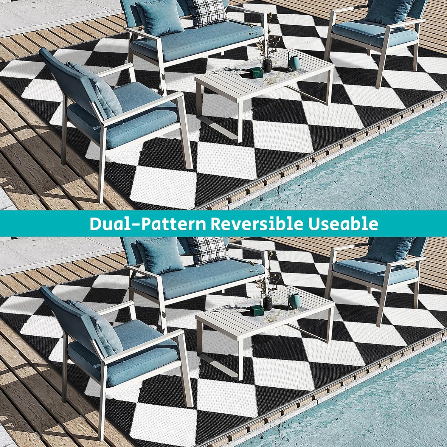 - Reversible Outdoor Rugs: Featuring a classic moroccan pattern on both sides, this rectangular 9x12 ft outdoor area rug allows you to instantly refresh your patio, porch, backyard, deck, RV campsite. And this outdoor deck rug is reversible, two-sided design allows you to have two different looks,both sides can blend perfectly with nature and look very full and comfortable.