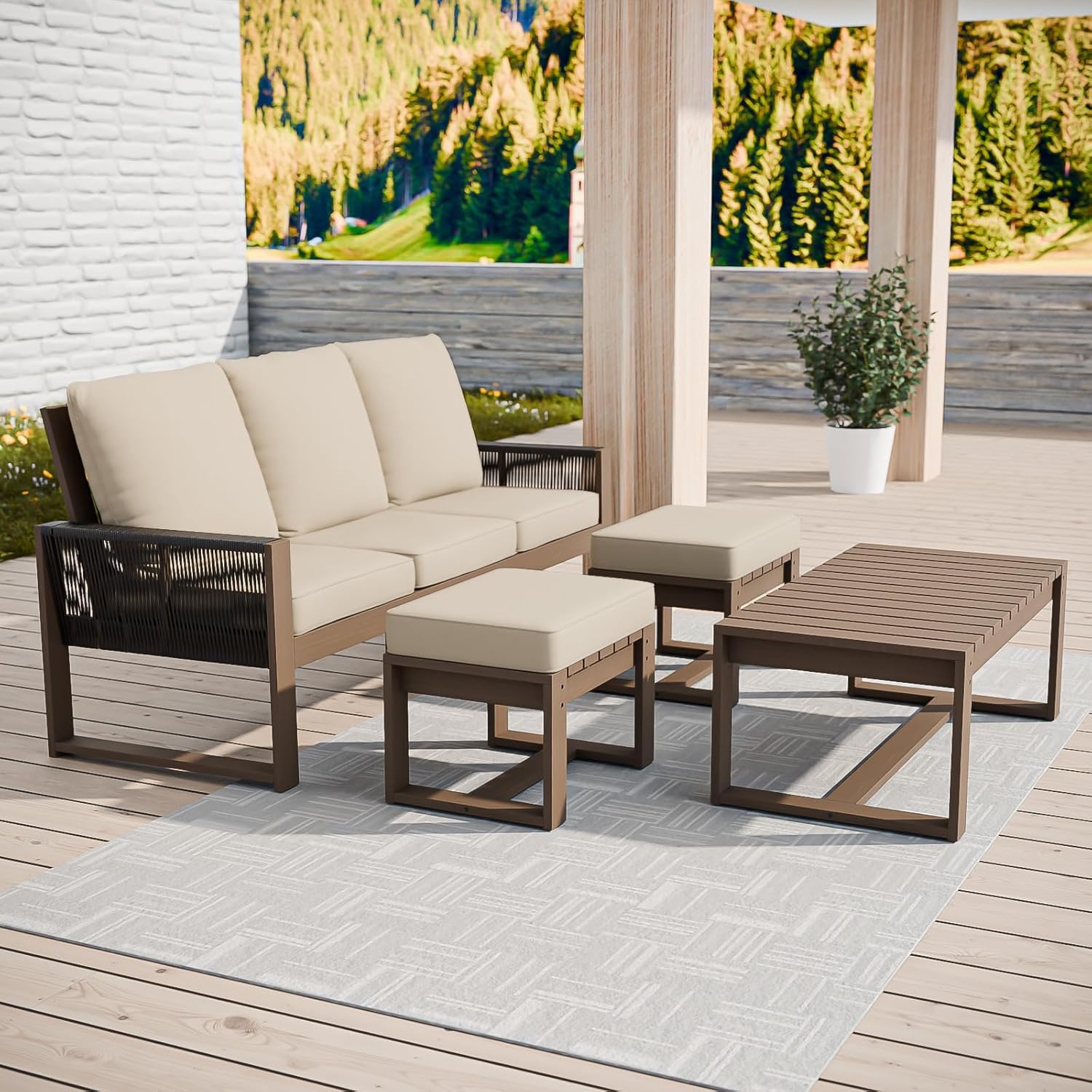 EAGLE PEAK Natural Wood Outdoor Patio Furniture, Cedar Furniture, Conversation Set, Outdoor Seating for Deck Patio Porch, Sofa, 2 Ottomans & Coffee Table, 4 Pieces, Brown/Beige