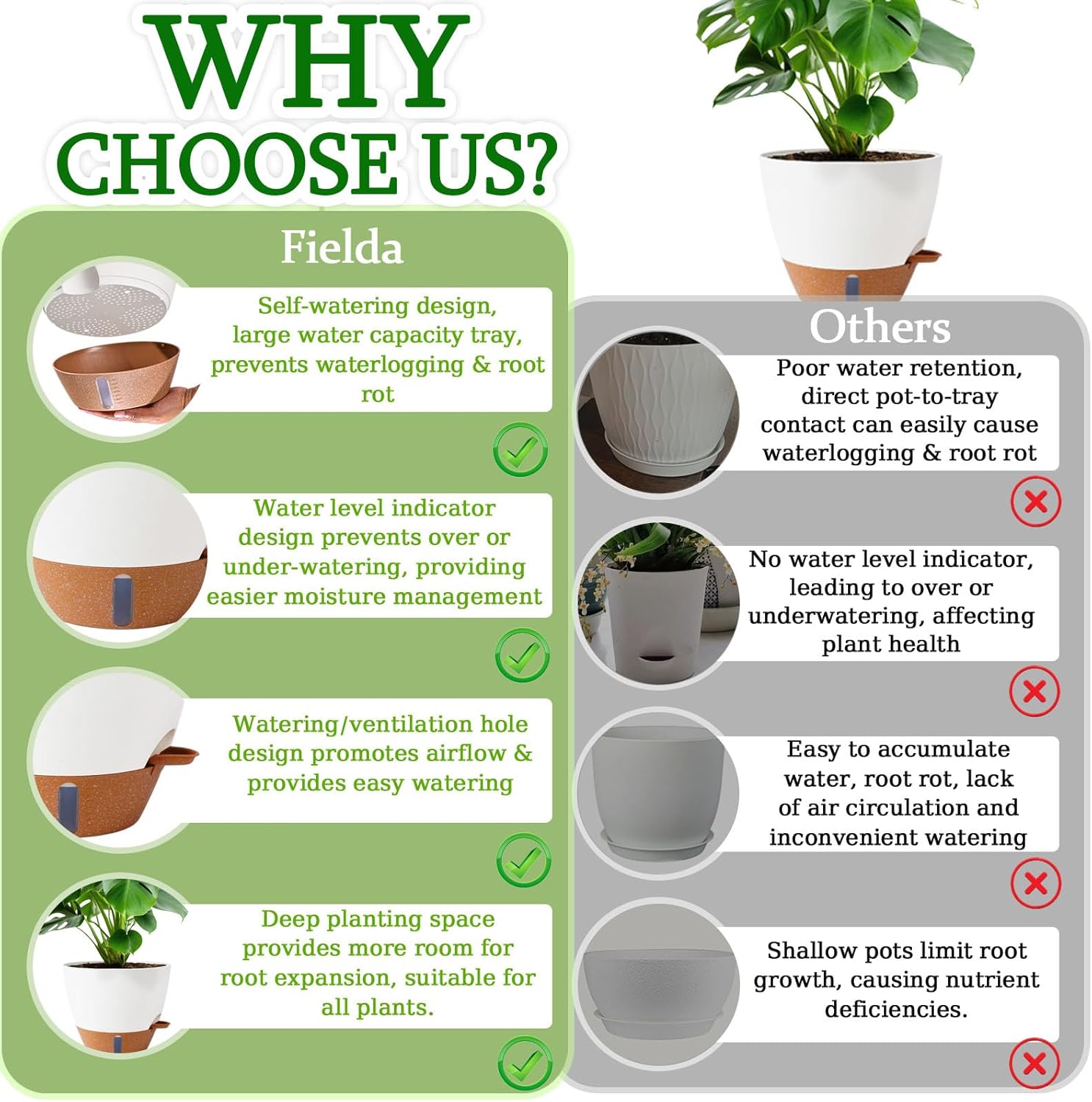 - đż ăSelf-Watering Pots with Water Level Indicatoră Designed for busy plant lovers, our 8/10/12 self-watering pots feature a built-in ABSORBENT COTTON WICK SYSTEM that automatically draws water from the detachable bottom tray. The TRANSPARENT WATER LEVEL WINDOW WITH MEASUREMENT MARKINGS lets you monitor hydration at a glance, ensuring no overwatering or underwatering. Perfect for indoor/outdoor plants, this system keeps soil evenly moist for up to 7-10 daysâideal for vacations or hectic schedules.