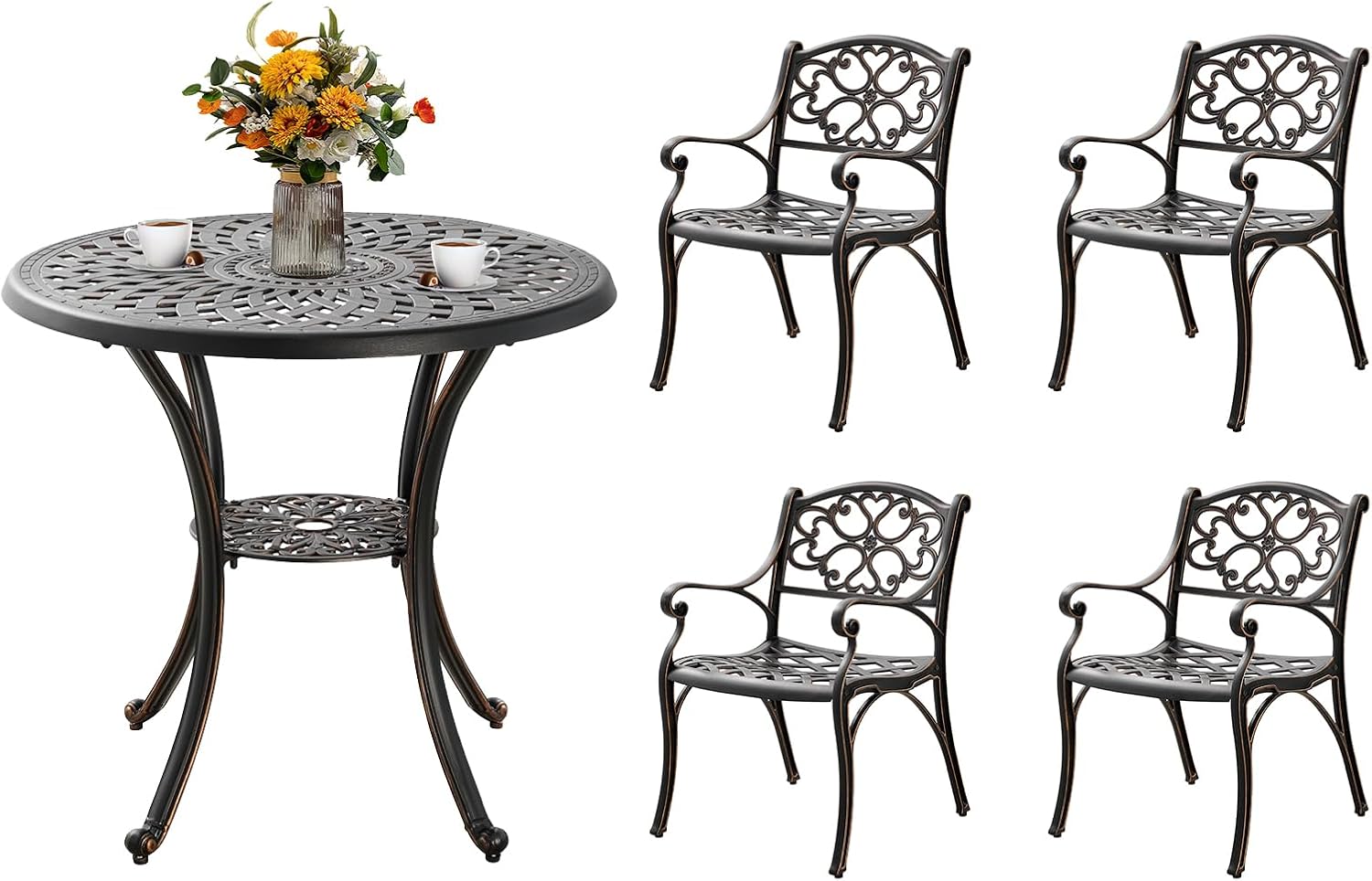 5 Piece Patio Dining Set, All Weather Cast Aluminum Outdoor Dining Table and Chairs Set of 4, Patio Furniture Conversation Set with 4 Chairs and 31" Round Table, 2.2" Umbrella Hole