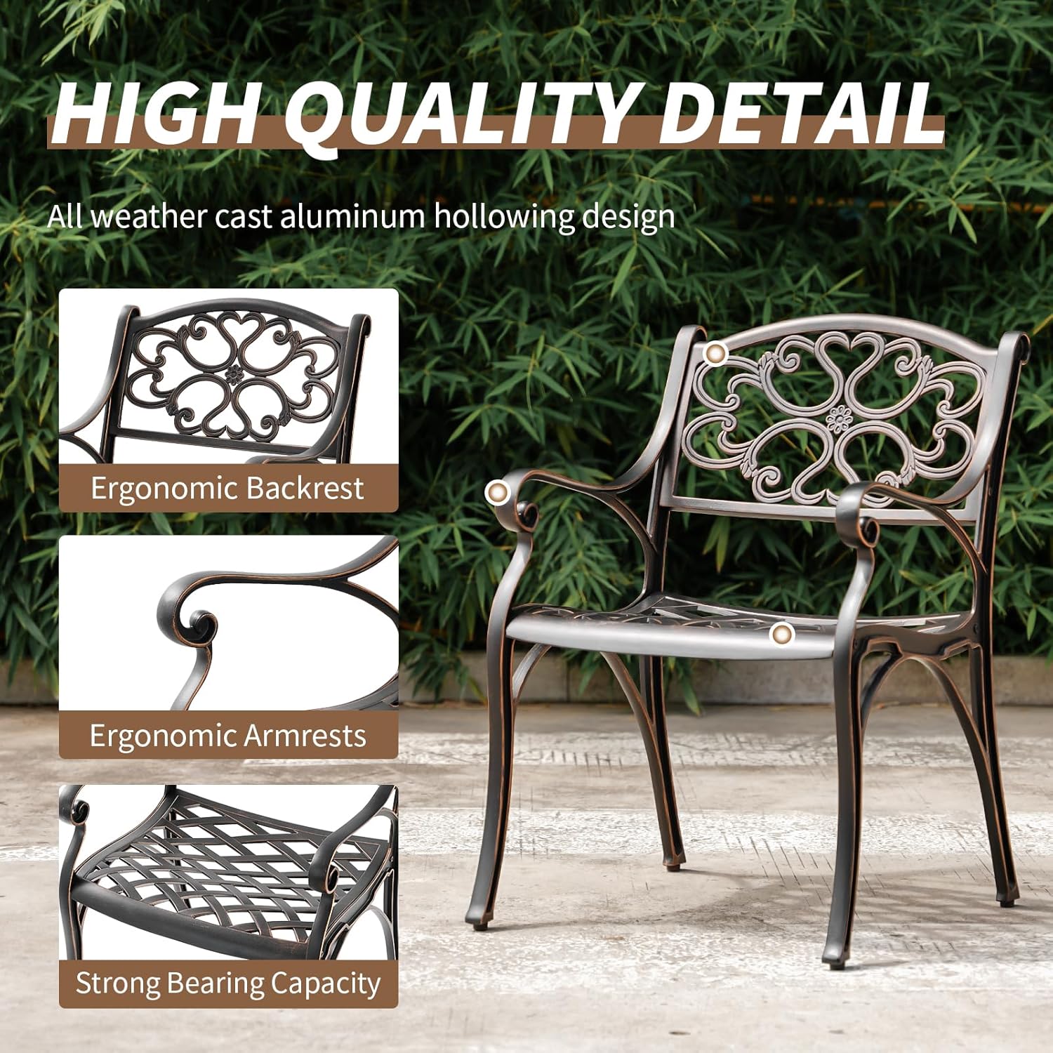- Durable Cast Aluminum Material: Made of premium cast aluminum, our patio dining chairs ensure long-term durability without easy deformation or breakage. In addition, the rust-proof and weather-resistant coating makes the chair set available for outdoor use all year round. makes the chair set available for outdoor use all year round.