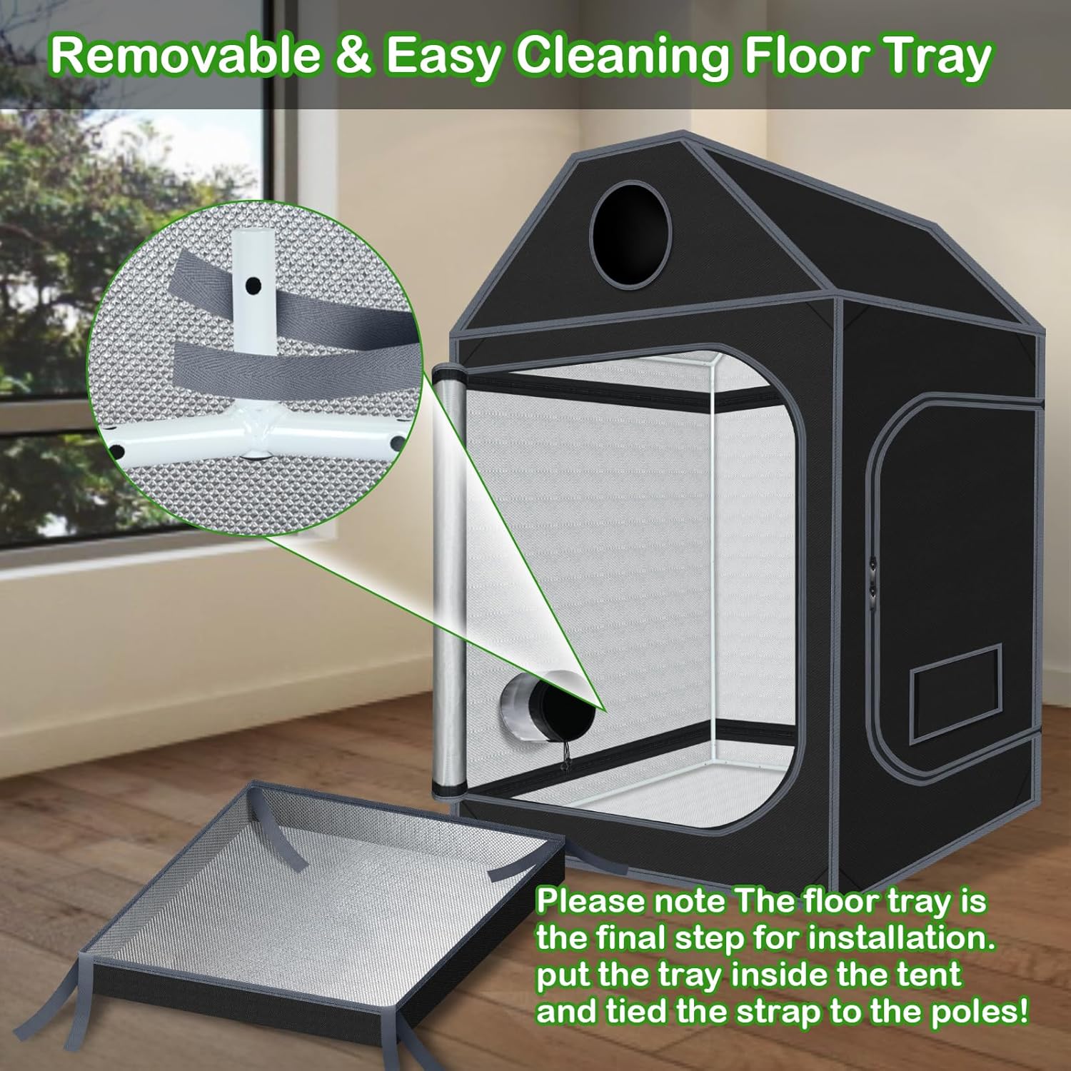 - Upgrade Design --- UPGRADED CONNECTOR--Durable PA Material Adopted, Anti-rust Reinforced Design, Adjustable Tightness According to The Pole, Hold Poles Tightly for Firmed Support. Multiple vents to accommodate fans and filter; ducting rectangle window with mesh to keep dust and insects out; Removable mylar floor tray easy to clean.