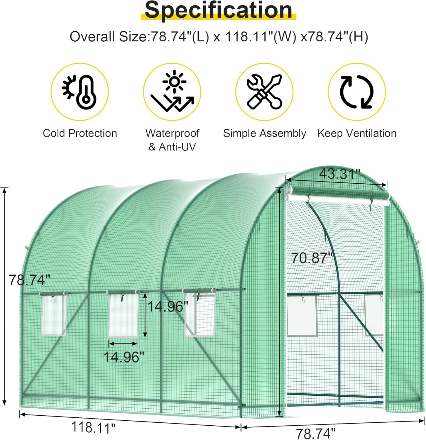 - 【Double Zipper Roll-up Door】The front door of the hoop greenhouse is equipped with 1 screen door to prevent small insects from flying in and harming your plants; another PE door is used for heat preservation.