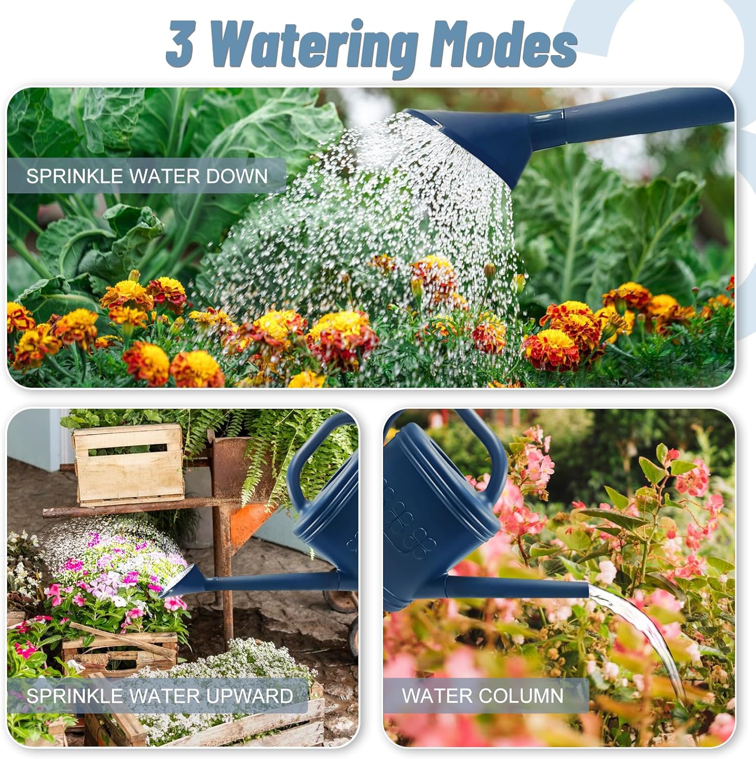 - Choose Freely, Switch Freely: Outdoor watering can with removable stainless steel shower head, can freely switch different watering modes, the shower head can evenly sprinkle water to protect delicate plants, and take off the shower head can be switched to the water column mode to water more water consumption of plants, which can meet the needs of different plants
