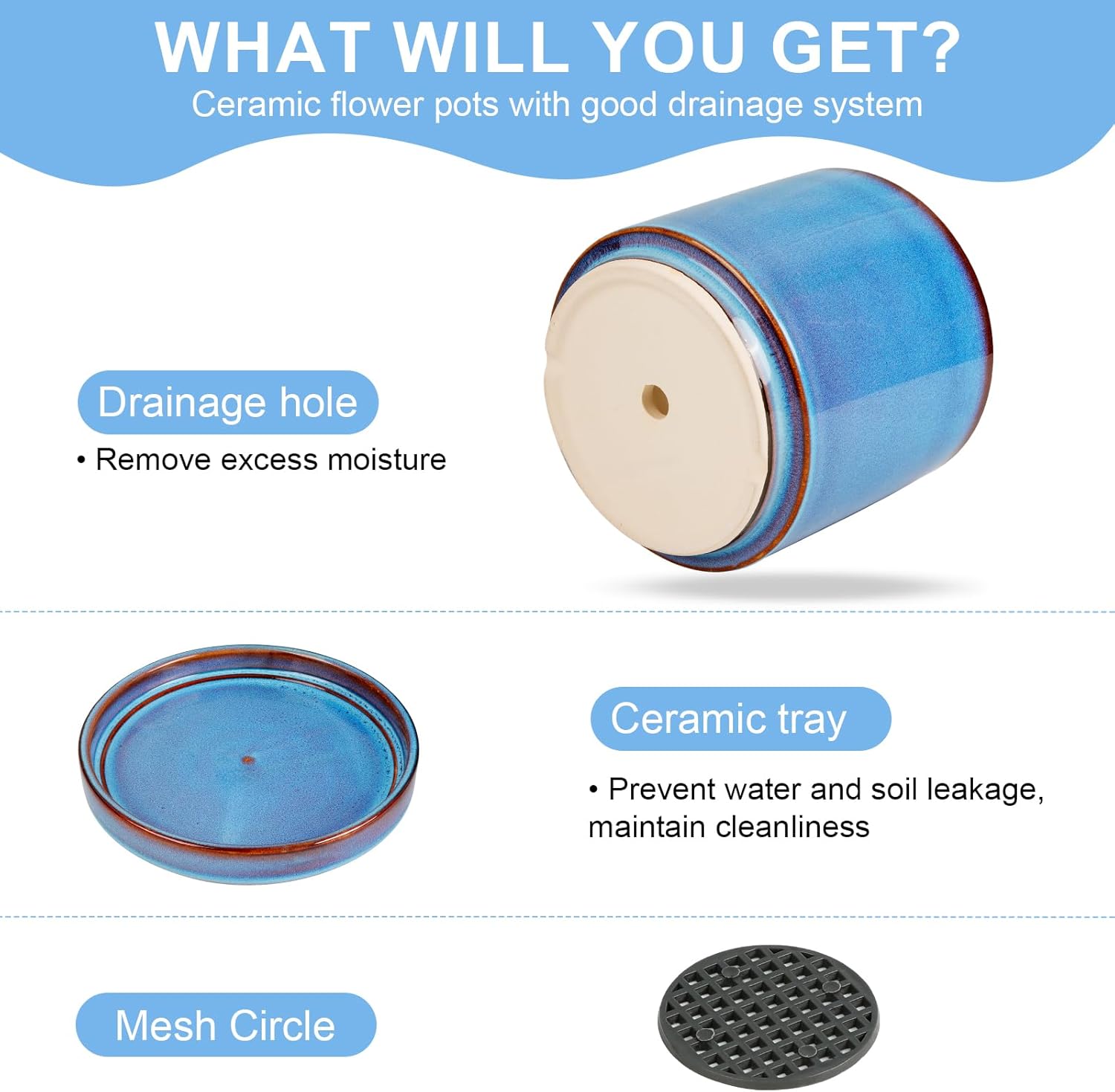 - Optimal Plant Care Features: Designed with a drainage hole and matching ceramic saucer, this ceramic pots for plants ensures proper water flow and prevents overwatering. The included mesh pad keeps soil in place, while the non-slip base offers extra stability, providing a safe and healthy environment for your plants