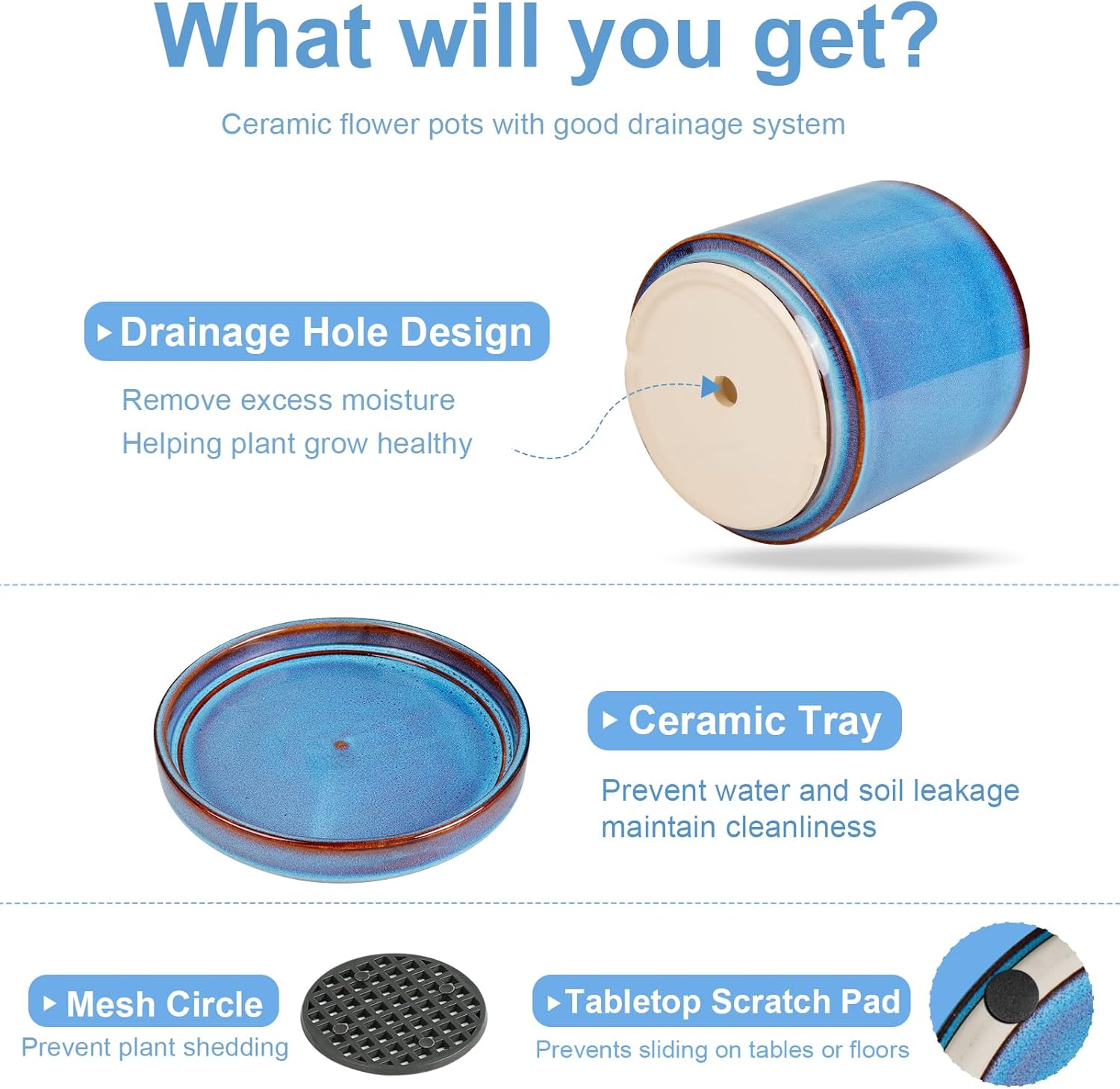 - Optimal Plant Care Features: Designed with a drainage hole and matching ceramic saucer, this ceramic pots for plants ensures proper water flow and prevents overwatering. The included mesh pad keeps soil in place, while the non-slip base offers extra stability, providing a safe and healthy environment for your plants