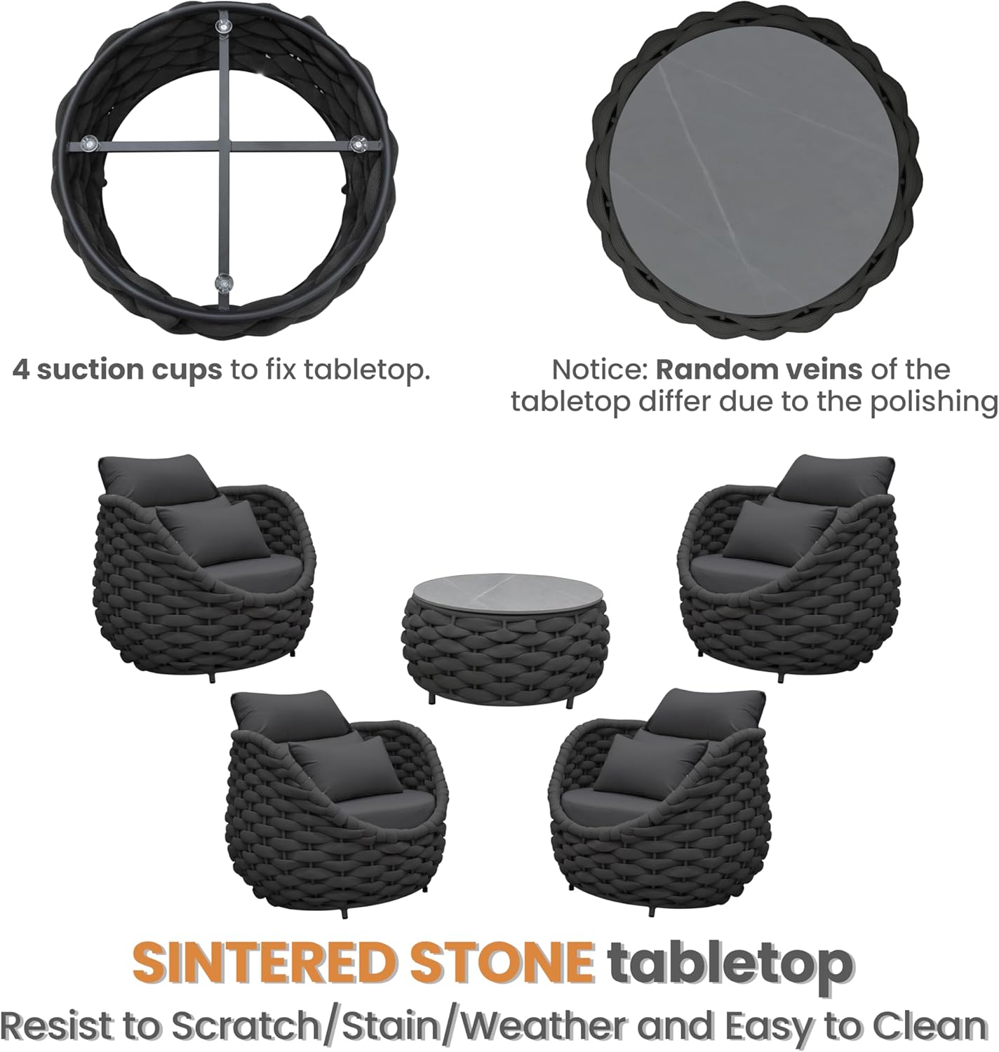 - Furniture set is crafted from reinforced rust-free aluminum alloy frame, wrapped in hand woven textilene rope. The 5 pieces all weather patio upholstered conversation set resists to UV, rain, wind, salt water. Perfect for indoor outdoor even arid or coastal areas