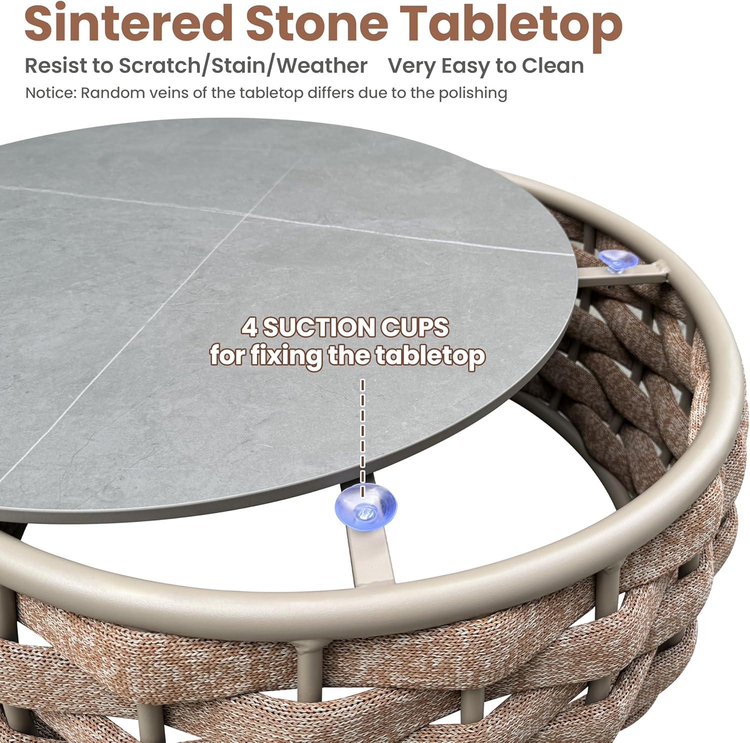 - Easy cleaning and scratch-resistant sintered stone tabletop is fixed by 4 suction cups. Cushions cover replaceable removal and machine washable. Adjustable nylon feet levelers for uneven floor also prevent scratching