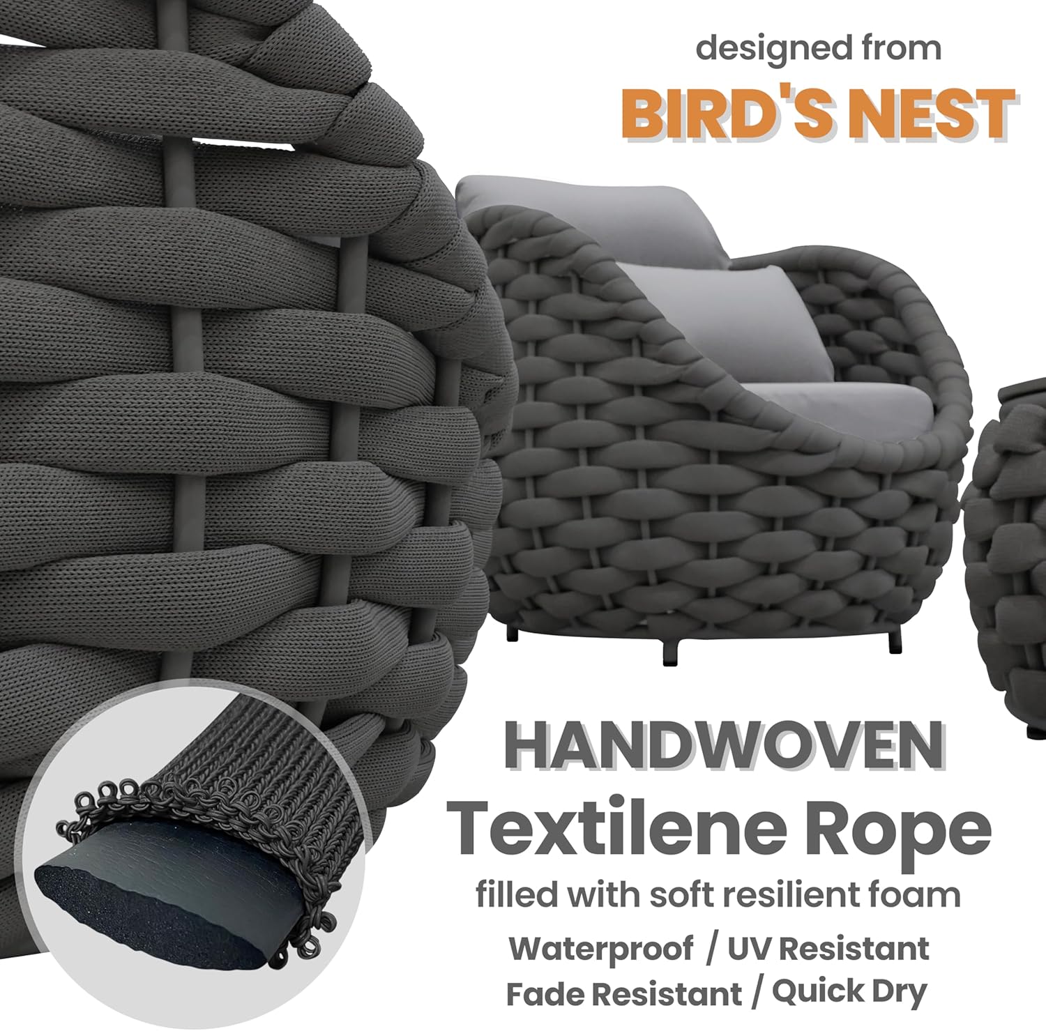 - Furniture set is crafted from reinforced rust-free aluminum alloy frame, wrapped in hand woven textilene rope. The 6 pieces all weather patio upholstered conversation set resists to UV, rain, wind, salt water. Perfect for indoor outdoor even arid or coastal areas