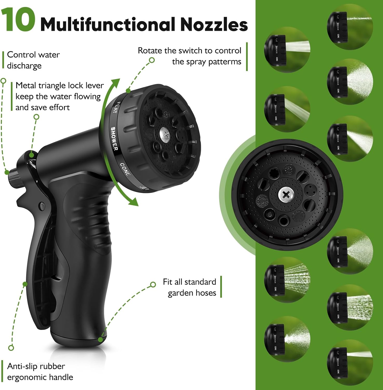 - Garden Hose Metal nozzle is made of metal zinc alloy and ABS plastic for greater durability and corrosion resistance. The thumb control makes this nozzle easy to hold and switch. In addition, the ergonomically designed nozzle grip features a non-slip rubber pad that is more comfortable to use and prevents slippage. The rotating baffle allows you to choose from 10 spray patterns to meet all your needs. Can be used for watering gardens and cleaning houses, cars, yards, pet bathrooms, and so on.