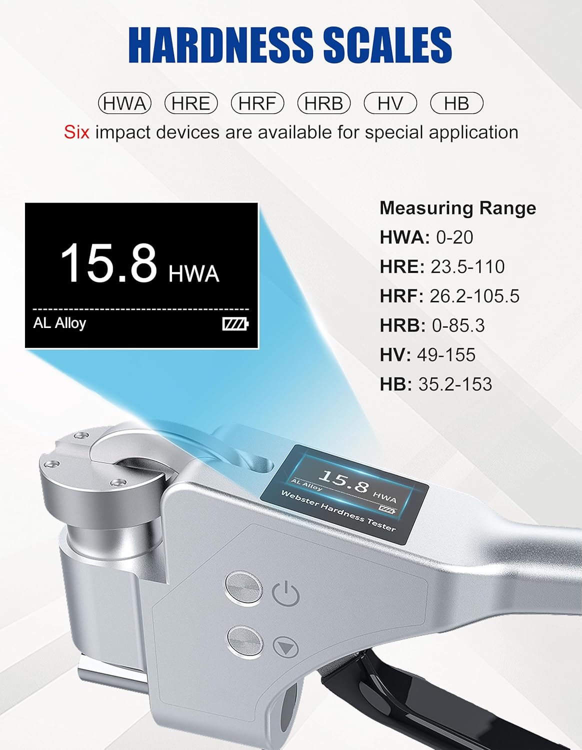- EASY TO OPERATE - The hardness tester is designed to be simple and easy to use. It can quickly test the hardness of metal materials such as aluminum alloy, brass, copper, and mild steel on site. The test can be completed by simply clamping the object to be tested, and the hardness value can be read directly.
