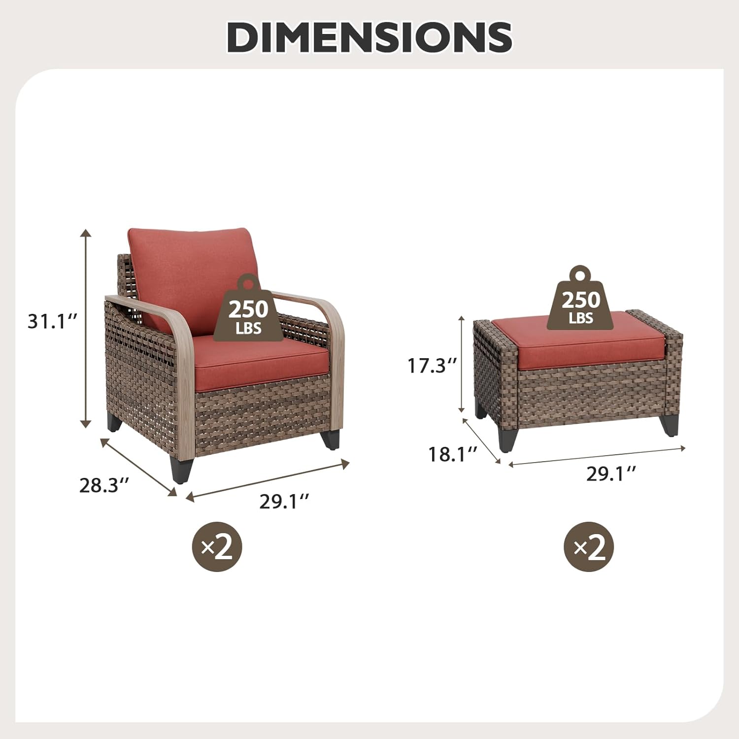- MEASUREMENT: With measurements of 29.1'' W x 28.3'' D x 31.1'' H, our outdoor chair combine style and strength. Crafted to support up to 250 lbs, this sturdy and durable outdoor furniture is perfect for enjoying your outdoor space without compromise.