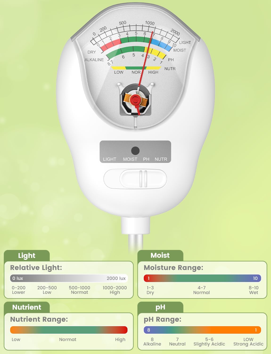 - Master your green thumb with 4-in-1 soil testing! Instantly check moisture, pH, light, and nutrient levels—no guesswork needed. Give your plants the perfect balance of water, fertilizer, and sunshine, and watch them thrive faster!