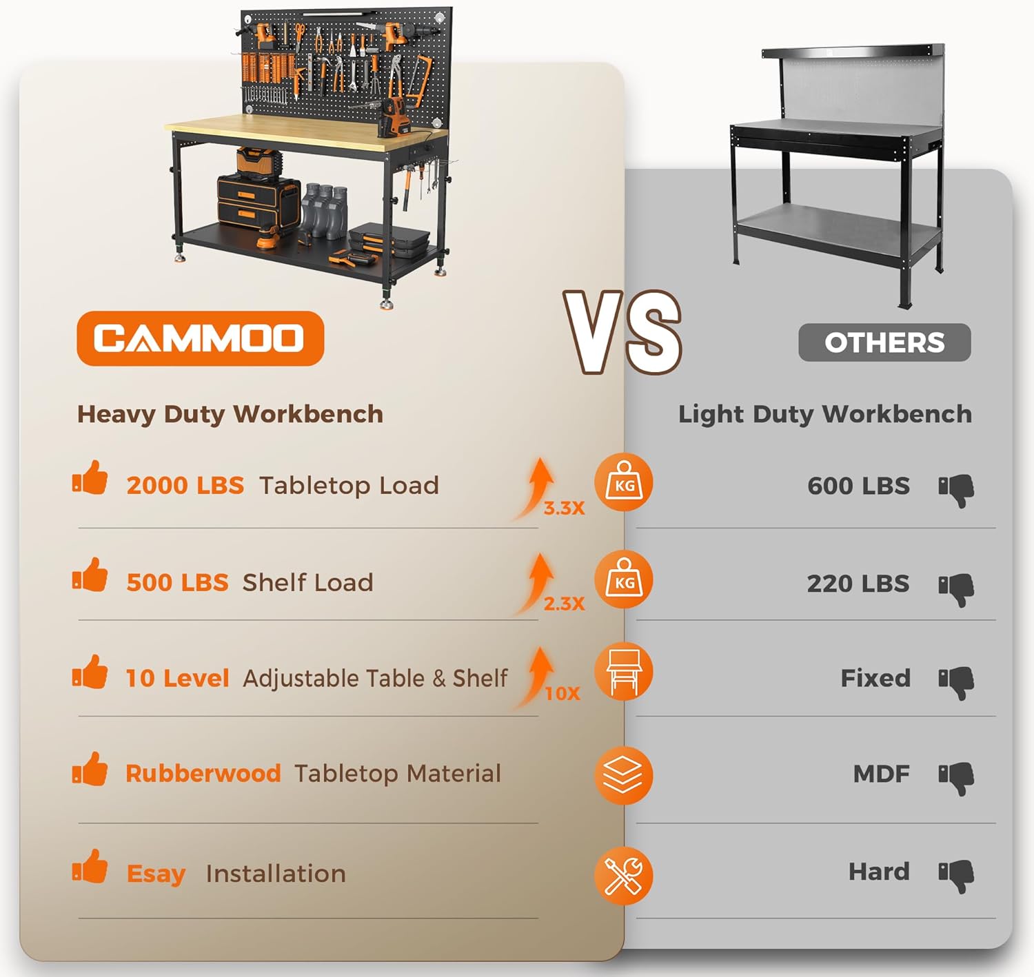 - [Customized to your needs] The Heavy Duty 48" L x 24" W x 38.7 "H adjustable workbench boasts a 10-level height adjustment function with 360° Tool-free Knobs, each level offering a 1.34-inch lift. This feature allows you to customize the work table height to your preference, whether you prefer to stand or sit. Our workbenches ensure a comfortable working environment. Meanwhile, adjustable metal feet adapt to uneven ground to maintain stability.
