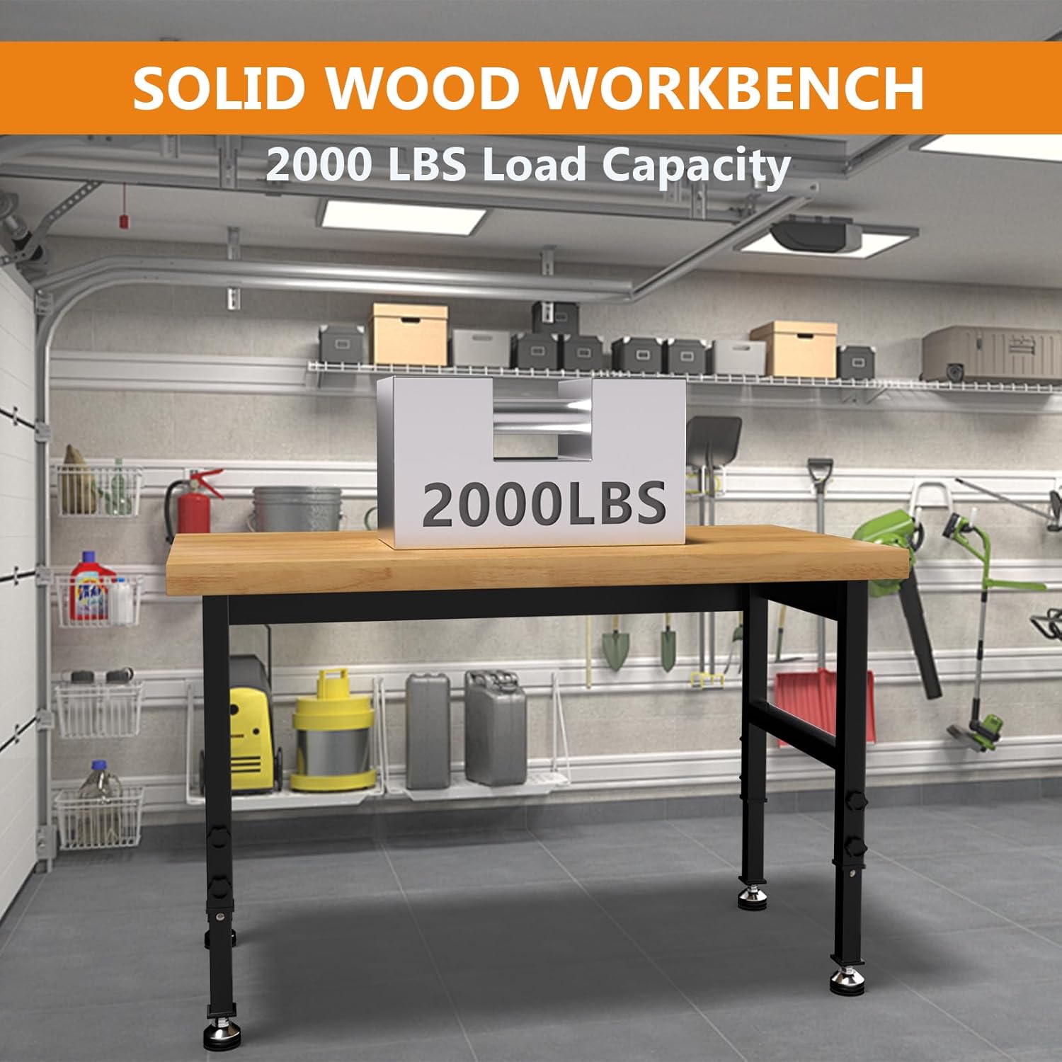 - Heavy-Duty Construction: Pelnuies work benches for garage is specially made of solid oak. The upgraded and thicker steel metal frame makes this workbench can hold up to 2,000 pounds to meet all your load bearing needs. The work table surface and metal frame are coated with an environmentally friendly varnish to support a longer service life.