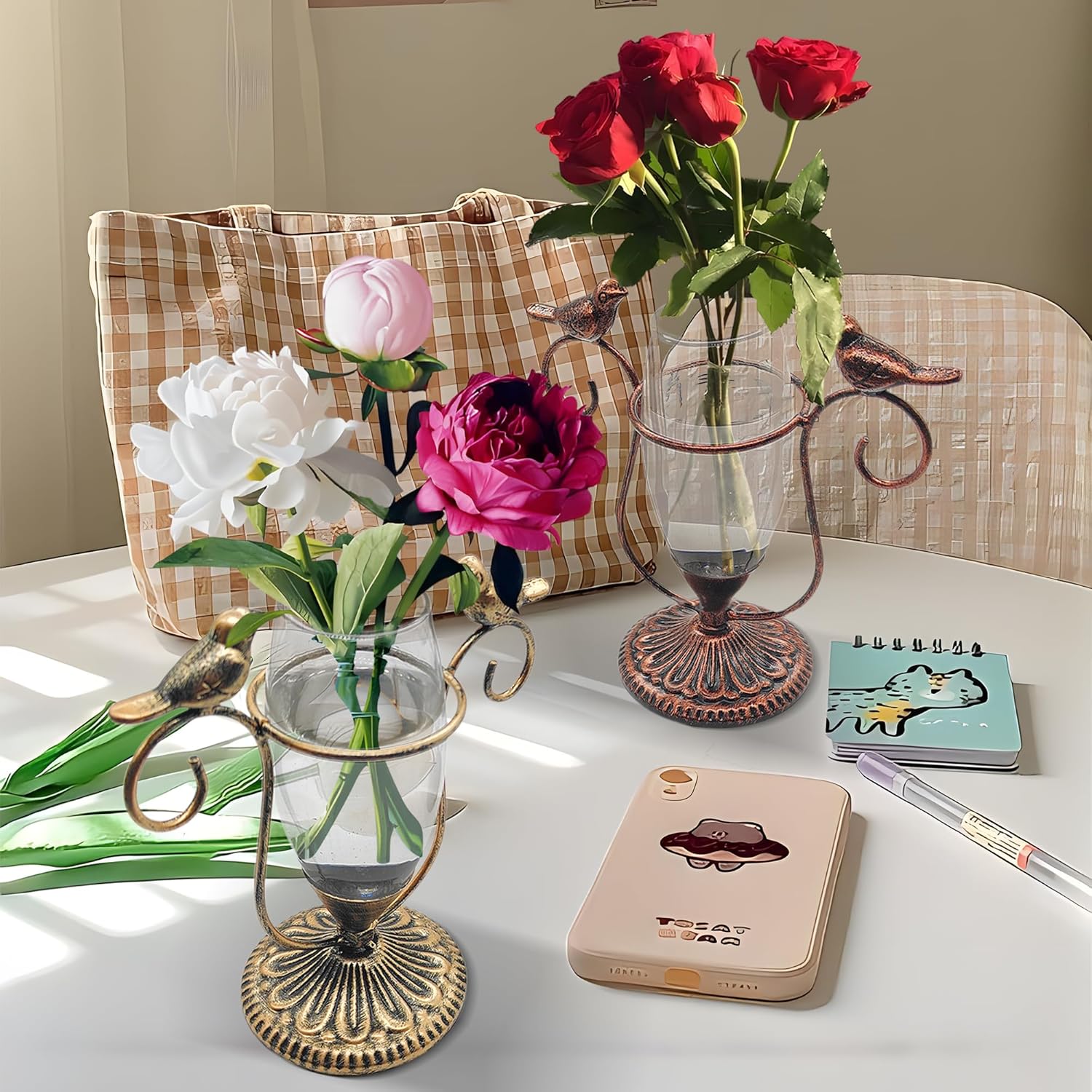 2 Pack Desktop Plant Terrarium,Bird Art Glass Propagation Vase, Propagation Planters with Vintage Metal Frame, Suitable for Decoration of Desktop Hydroponic Plants in Office and Living Room