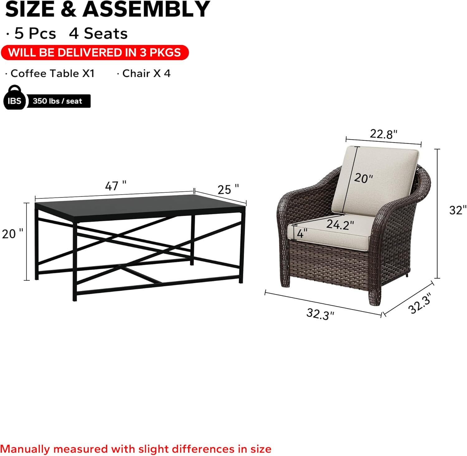 - Packing Included: The 5 pcs set includes 4 x single armchairs, 1 x coffee table. The tools and instructions needed for installation will also be in the box.The 5 pieces patio dining set will come in 3 boxes. They may come in different days