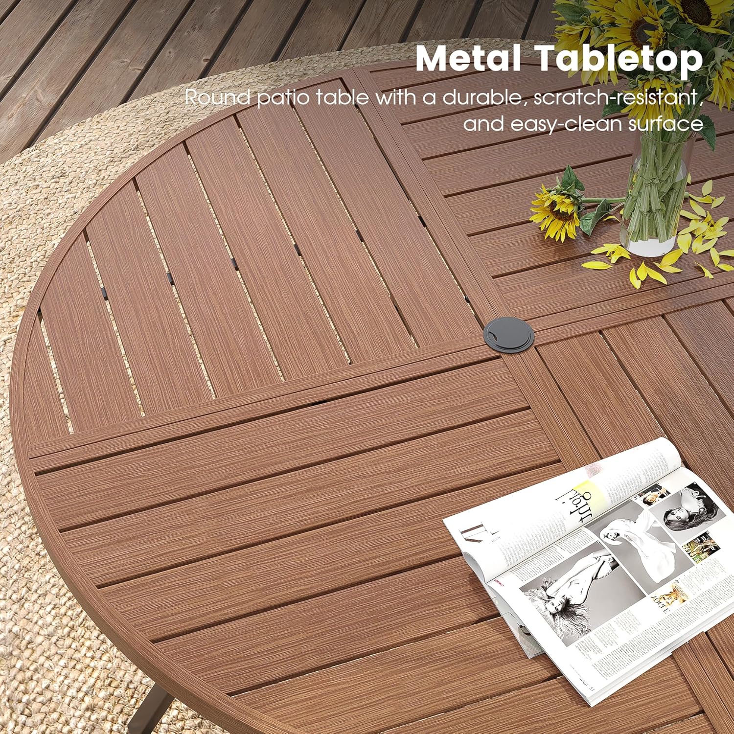 DIFY 40.6" Round Outdoor Patio Dining Table for 4, All-Weather Metal Steel Slatted Patio Table with 1.57" Adjustable Umbrella Hole, for Lawn Garden Porch Backyard, Walnut
