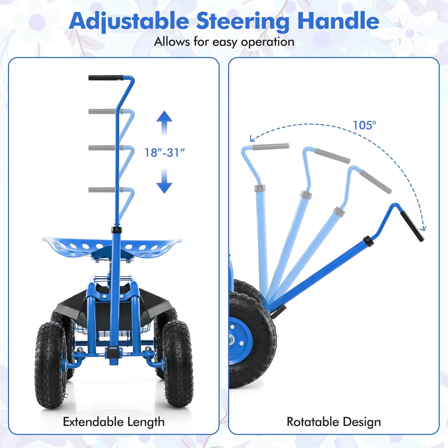 - Tires & Extendable Steering Handle: Our patio wagon scooter has four 10'' inflated rubber tires which have deep patterns on surface to prevent slipping. Coming with an extendable steer rod with comfortable handle in the front of the garden cart, you can conveniently move the gardening work seat.