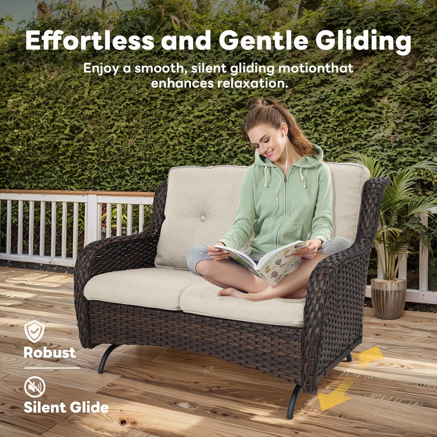 - Smooth Glider Loveseat & Swivel Rocker Chairs: Enjoy the comfort of the cozy loveseat glider chair for two, offering a gentle back-and-forth motion, paired with two swivel rocker outdoor chairs that provide a full 360° rotation. These features ensure your wicker patio furniture offers the perfect blend of relaxation and movement for enjoyable outdoor conversations.
