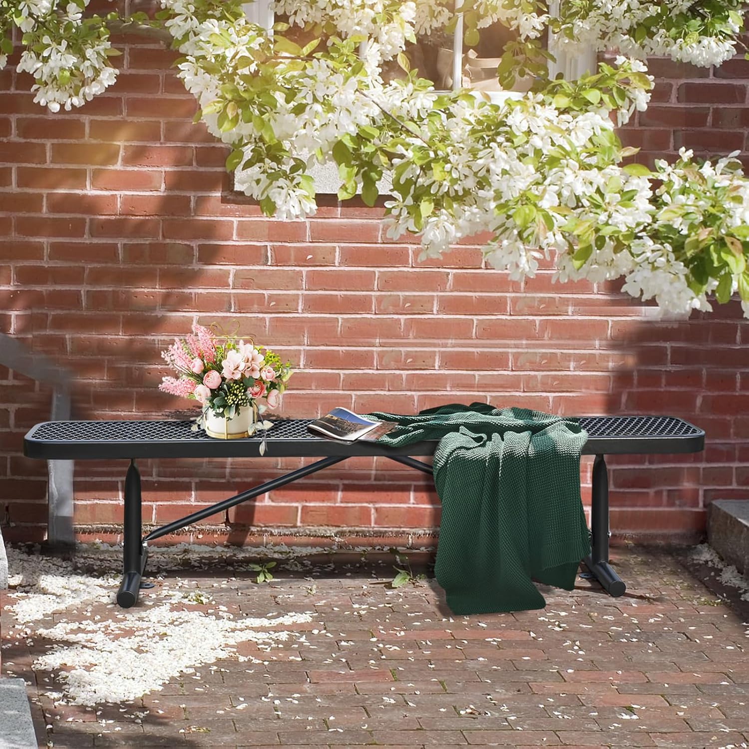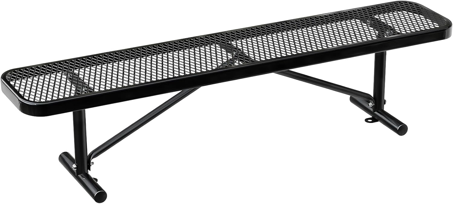 - Superior Craftsmanship: This 6 FT heavy duty park bench, sized at 48"-96”L x 23.2”W x 32.5”H, comfortably accommodates 2-7 people. Featuring a mesh cut-out design on the seat, it ensures both comfort and reduced weight, while stabilizing triangular supports provide a smooth seating experience.