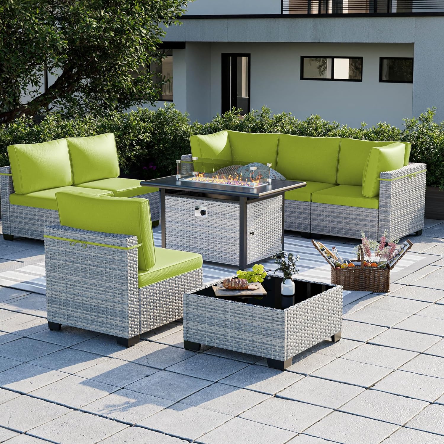 8-Piece Patio Furniture Set, Outdoor Patio Furniture with 55,000 BTU Fire Pit Table, Thick Cushions, Modular Patio Sofa, Dual-Strand Wicker Rattan, Rust-Resistant Frame, Grass Green