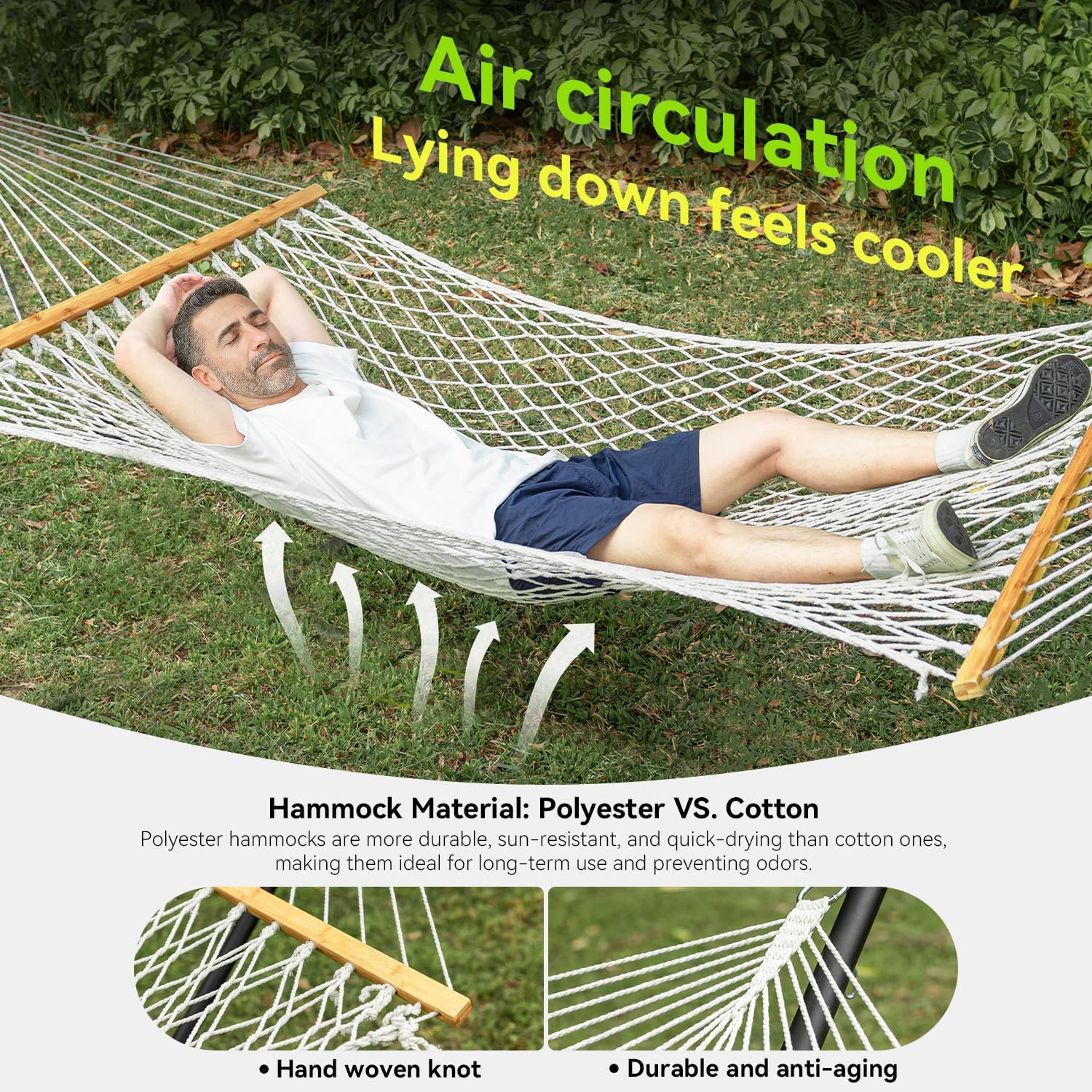 - Handwoven Comfort with Hardwood Support:The breathable polyester mesh design keeps you cool, while reinforced hardwood spreader bars provide stability and a flat, supportive surface. Combines durability with cloud-like comfort!