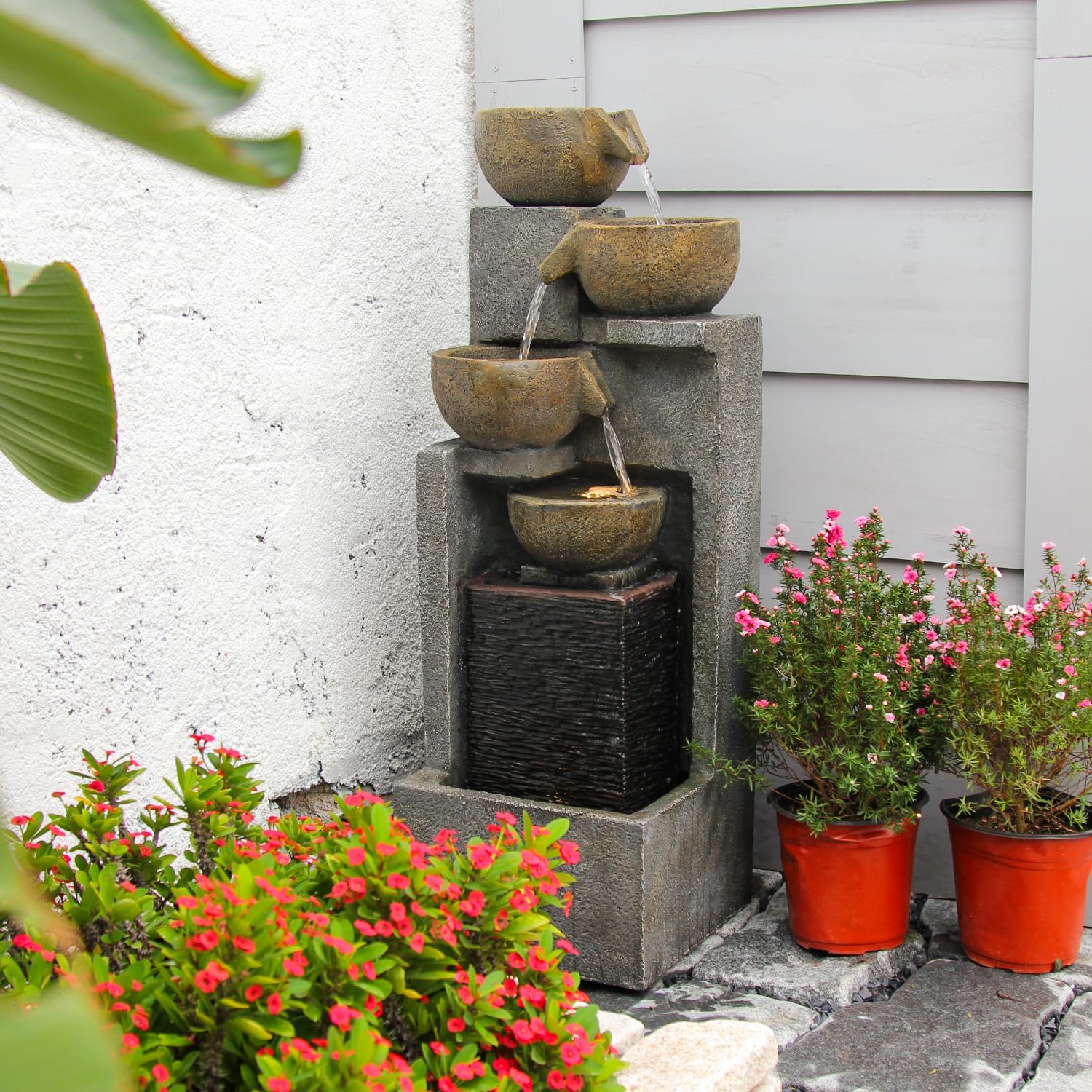 - Modern 5-Tier Design: YZM outdoor water fountain feature a modern design combined with natural elements. The 4-tier bowl design, along with 1-tier cascading tower design, and the gray and brown colors harmonize to create a modern work of art that is a great addition to any home décor