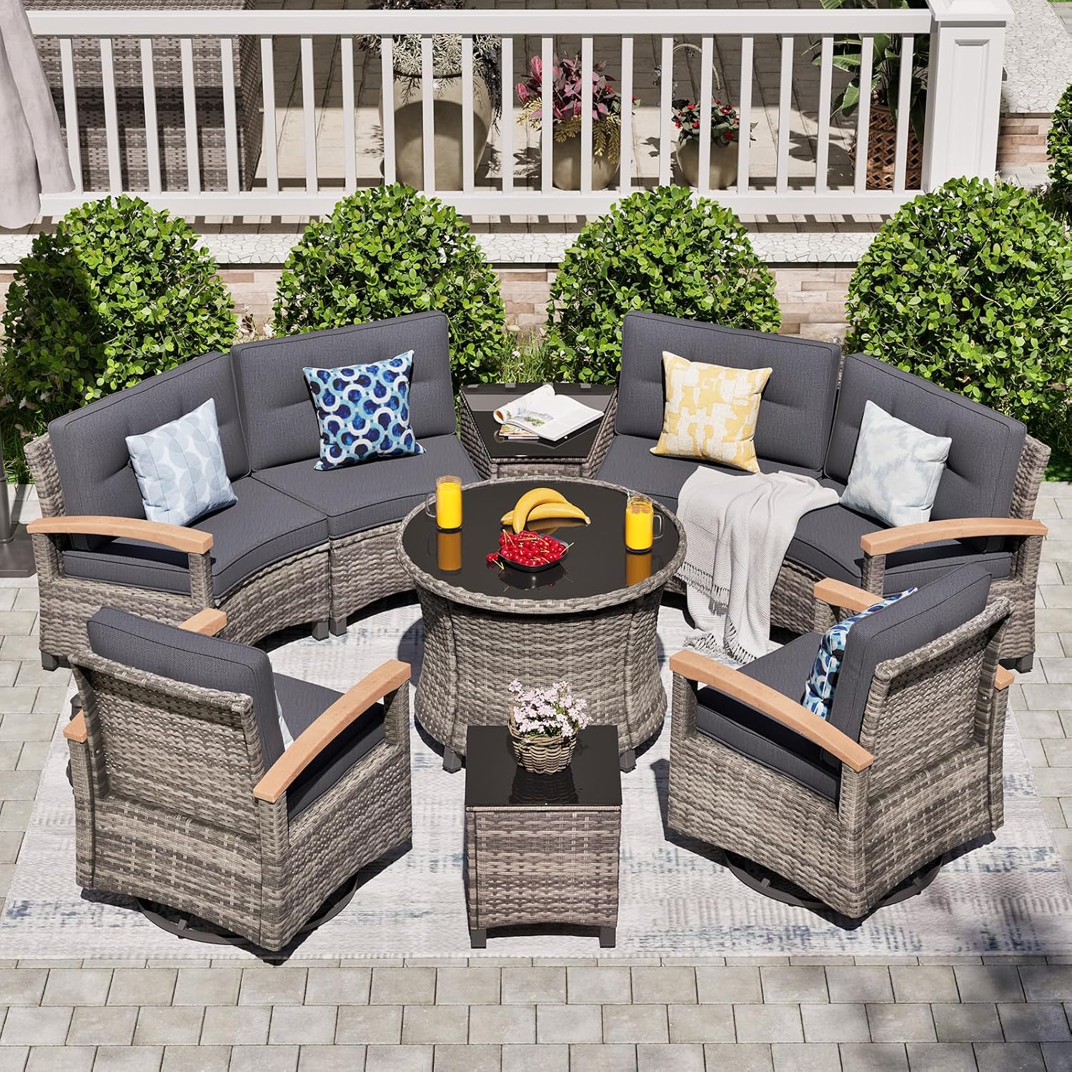 9 Piece Outdoor Patio Furniture Set, Half-Moon Curved Sectional Sofa Rattan Conversation Set with 2 Wood Armrests Swivel Rocker Chairs, Round Coffee Table & Side Table(Grey)