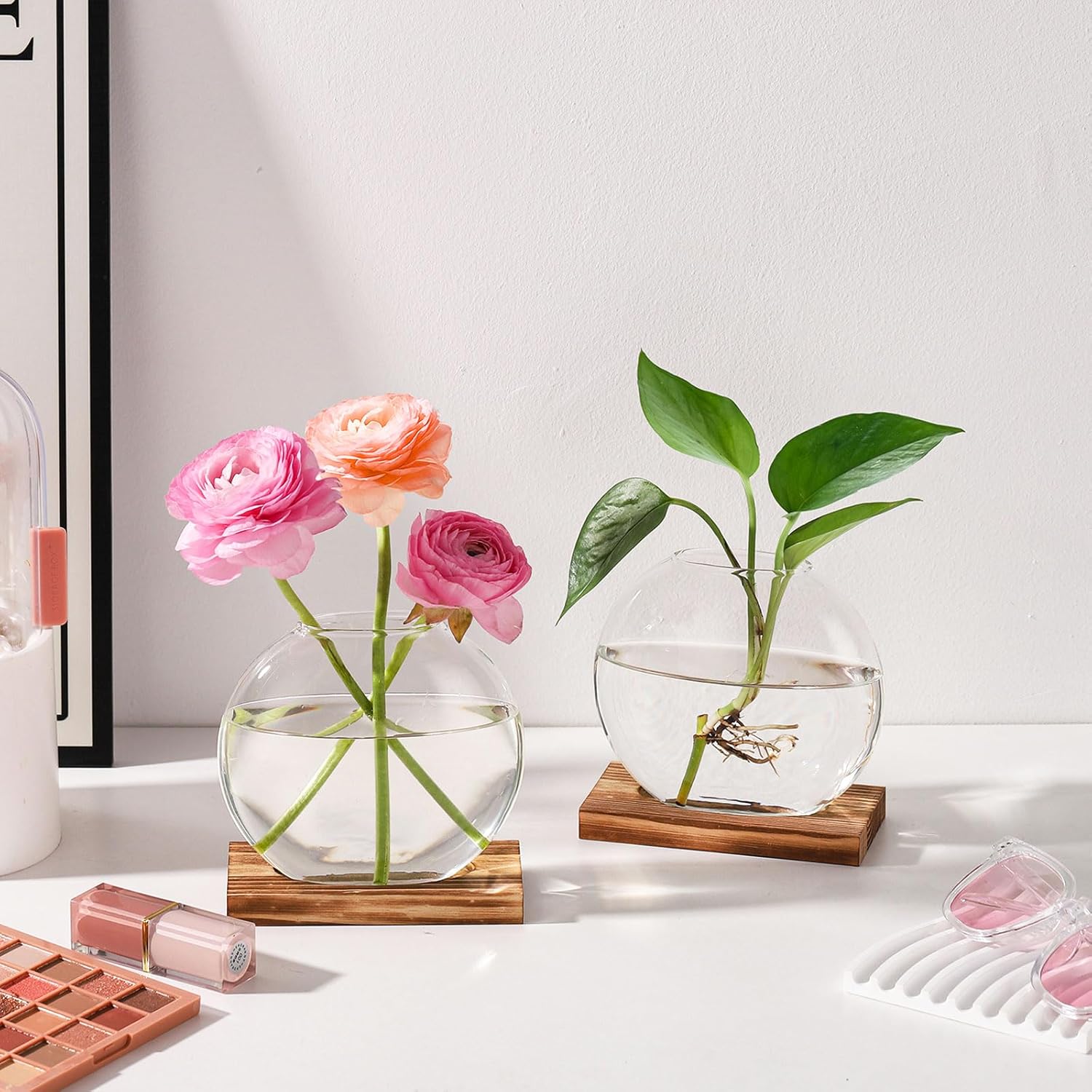 4 Pack Plant Propagation Station with Wooden Base Glass Terrariums for Indoor Plants Decorative Round Vases for Flowers Hydroponic Planter for Home Office Decor