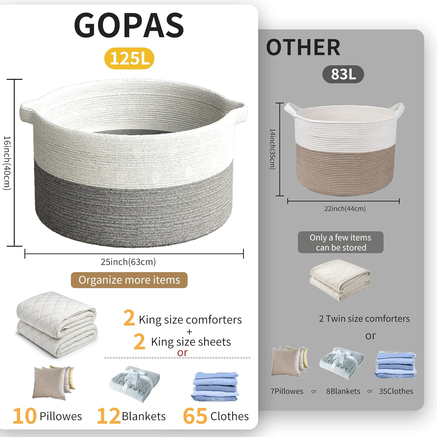 125L Extra Large Blanket Basket, 25" x 16", Jumbo Laundry Woven Baskets Decorative Home, Cotton Rope Basket with Handles, Baby Toy Baskets for Storage, White & Gray