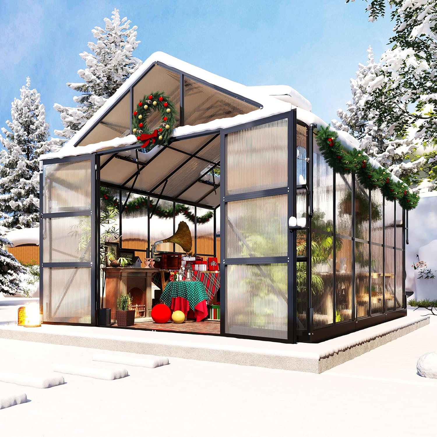 AMERLIFE 10x12 FT Heavy Duty Aluminum Greenhouse with 4 Roof Vents & Rain Gutter, Polycarbonate Greenhouse for Outdoor Garden Backyard, Black