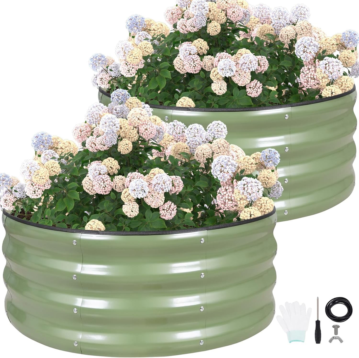 G GOOD GAIN Round Raised Garden Bed - 2Pcs 3x3x1ft Galvanized Steel Planter Boxes Outdoor with Rubber Edge Trim | Metal Raised Beds for Gardening Vegetables Flowers Fruits Herbs (Olive Green)