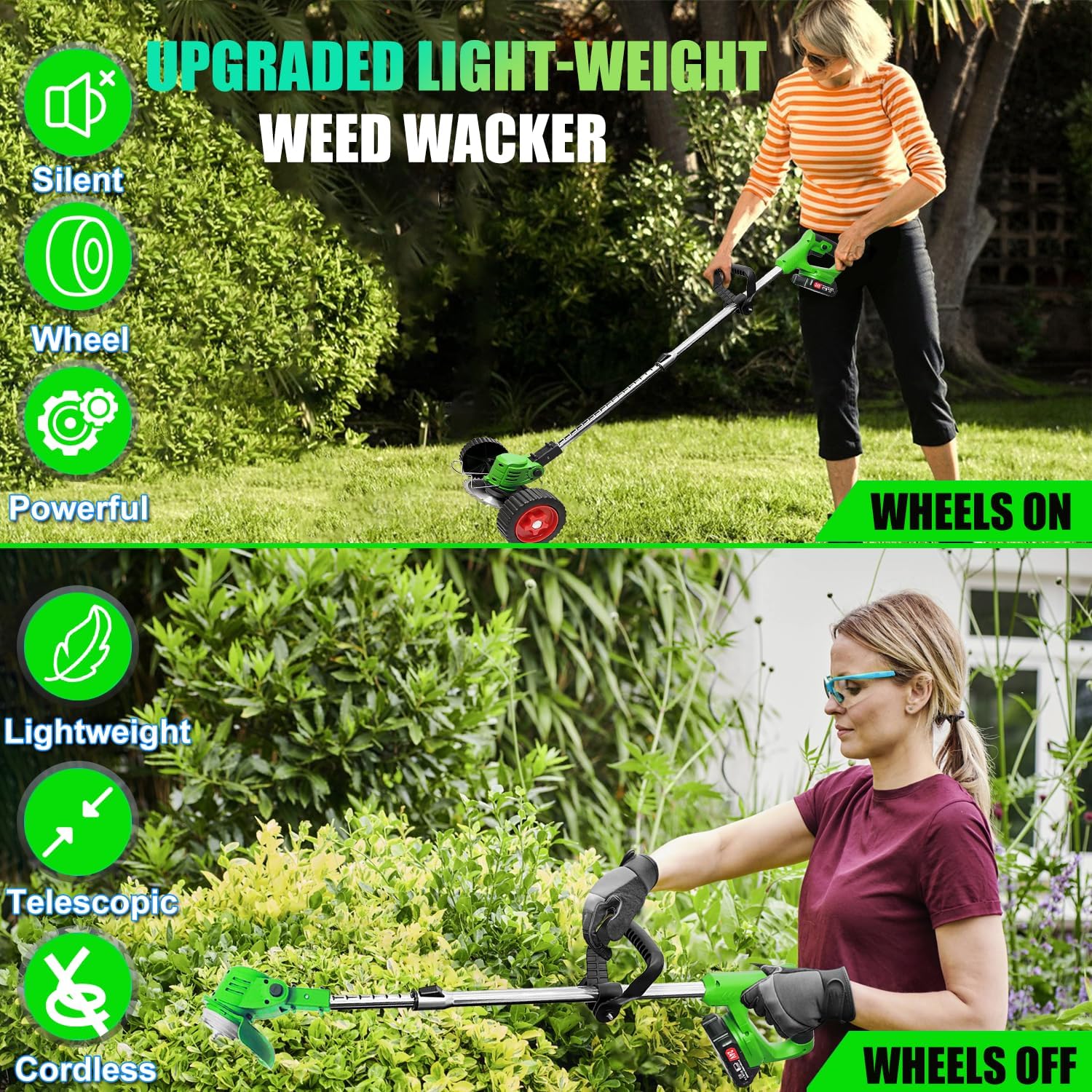 - 【ADJUSTABLE HEIGHT & ROTATING HEAD】Cordless weed wacker battery operated the handle adopts ergonomic design Adjustable length of telescopic shaft which total length is about 35-47 inches, the angle of the String Trimmer Cordless head can be adjusted (0-90°) at will to fit for most complex working environments. Weed wacker battery powered women and the elderly can easily use, allowing you to easily care for any hard-to-reach nooks and crannies