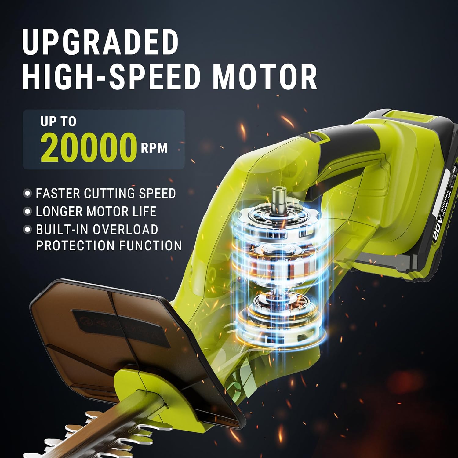 - [Powerful cutting ability] EWORK hedge trimmer cordless is equipped with a reinforced copper wire motor and built-in overcurrent protection program, which improves the stability of hedge trimmer operation and prolongs service life; equipped with a 22-inch double-action laser blade with a cutting diameter of 5/8 inches, this hedge trimmer can complete almost all garden work and bring you an extraordinary hedge trimming experience