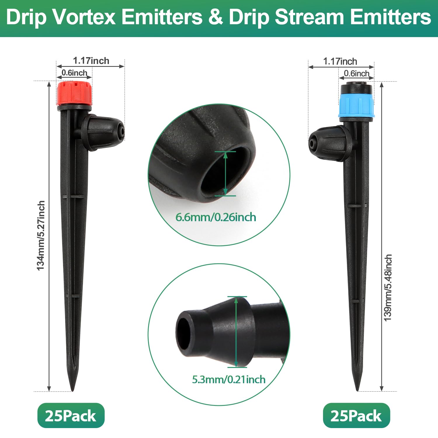 - 【Set of 50 Adjustable Drip Emitters for 1/4" Drip Irrigation Tubing】25 pieces drip irrigation fan shape emitters and 25 pieces drip irrigation stream emitters in total, specifically designed for 1/4" drip irrigation tubing. Each 1/4" drip irrigation emitters features an adjustable 360-degree water flow dripper mounted on a 5.5" arrow stake, making it the perfect choice for efficient irrigation across your garden. With capabilities to spray water across a diameter of 0 to 10 feet, it’s an essential addition for anyone looking to optimize their irrigation system