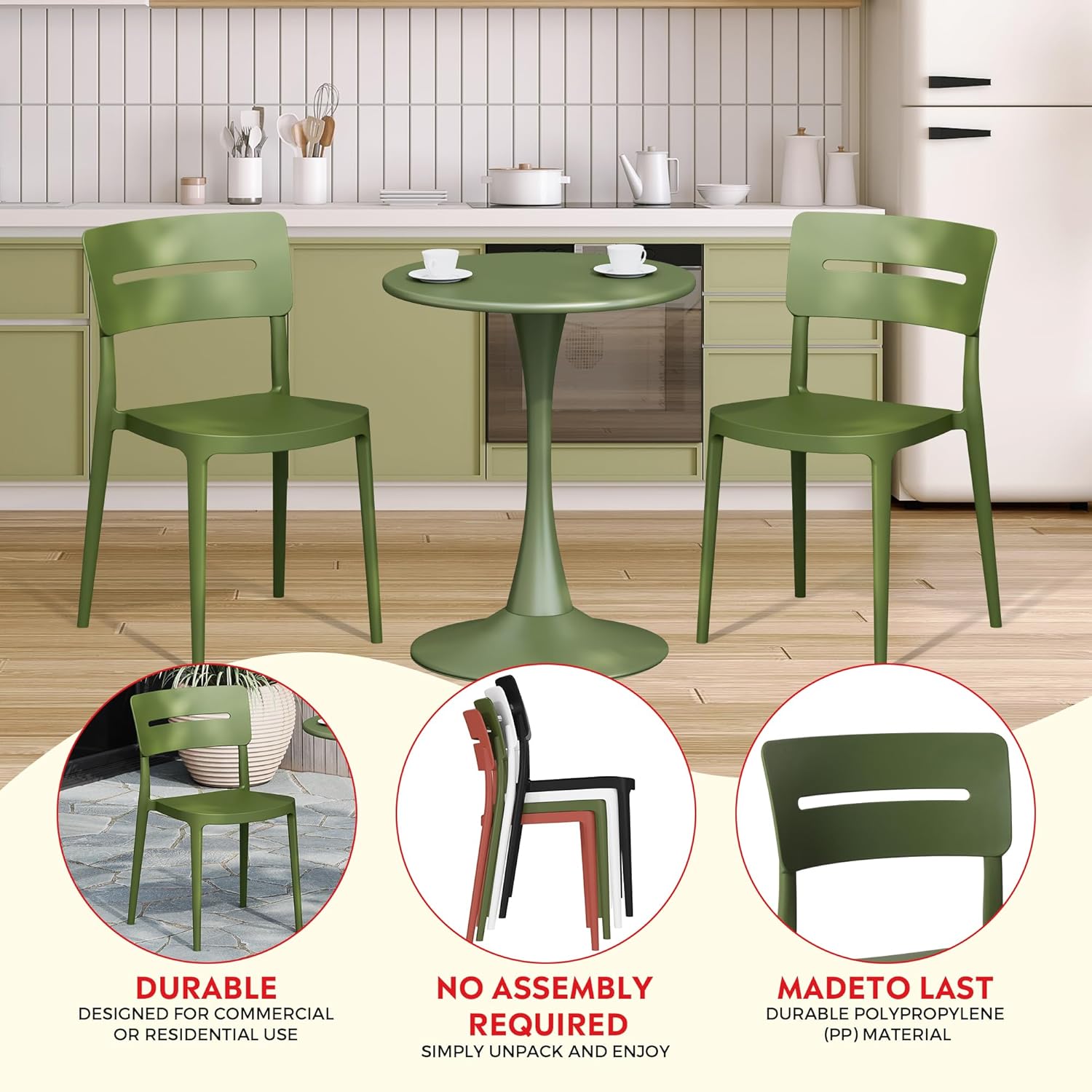 5-Piece Outdoor Dining Set, HDPE Patio Square Bistro Table and Stackable Chairs Sets for 4, Patio Furniture All Weather for Backyard Poolside, Olive Green