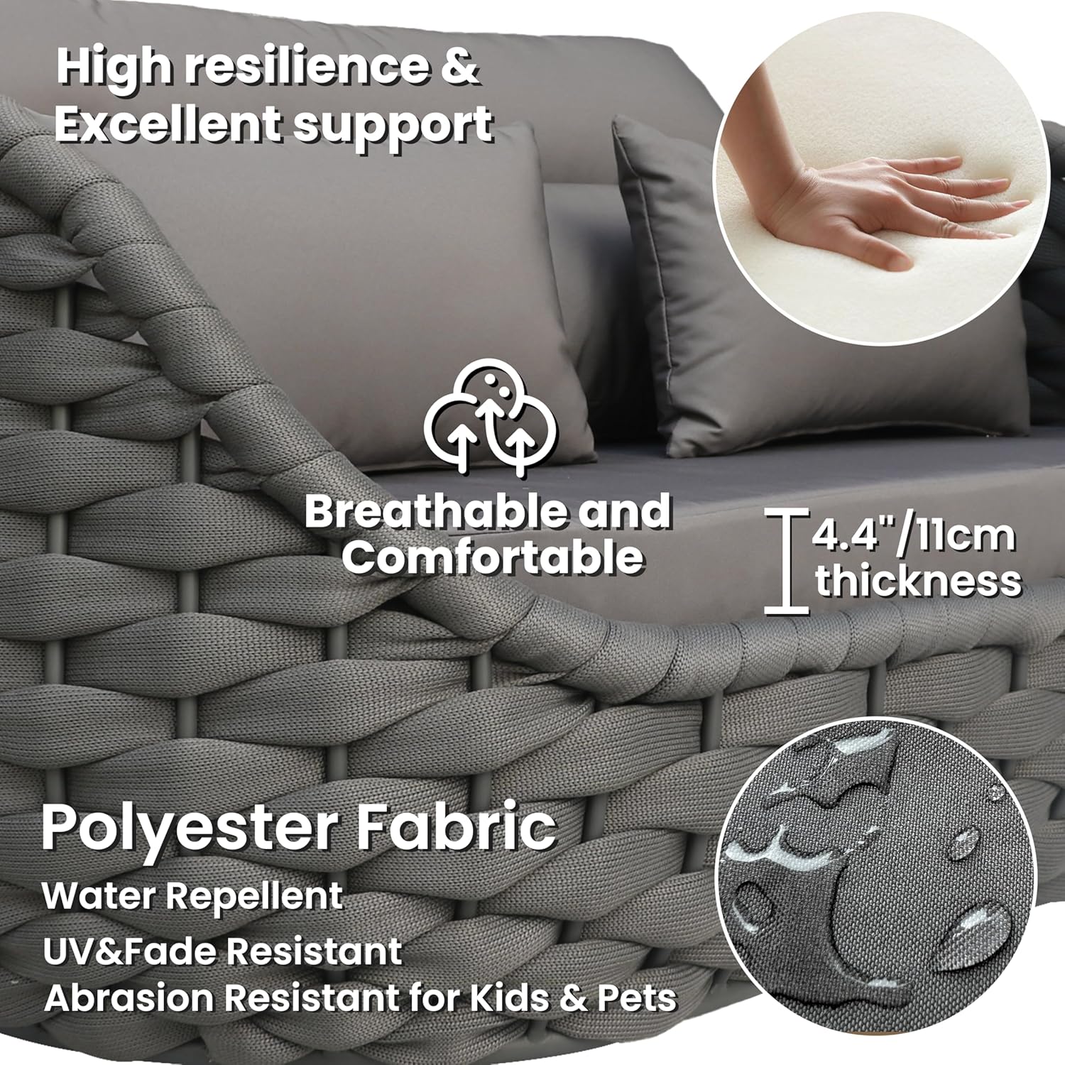- Filled with 4.3"/11cm thick high-density foam and cotton, cushions are soft touching and breathable for a refresh comfy patio seating holding its shape in long time using. Water repellent and abrasion resistant polyester fabric also fits families with kids and pets