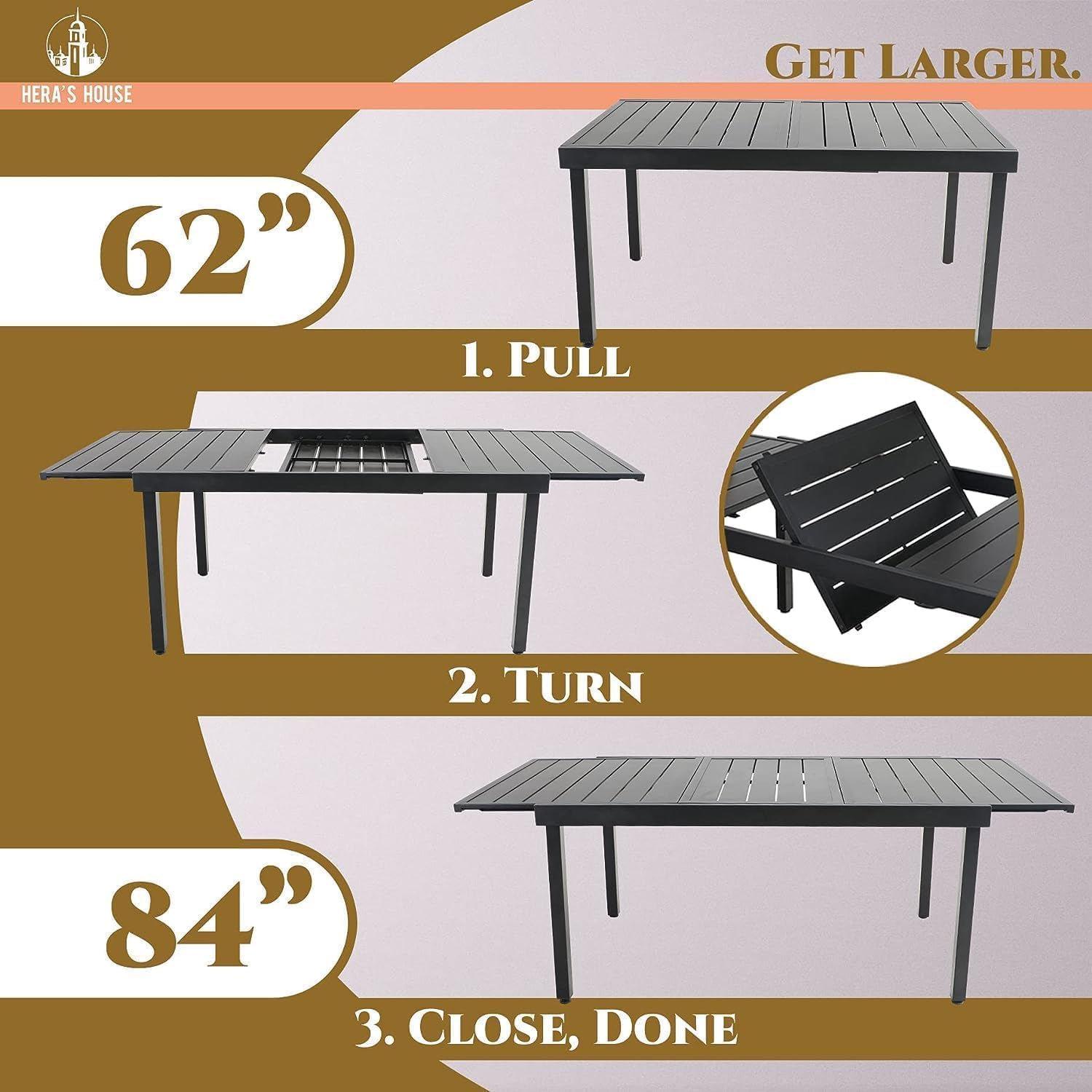 - ă62"/84" MORDEN EXTENDABLE SLATTED METAL TABLE TOPăLarge rectangle surface for 6-8 person, enough space for your leisure time with your friends or family. HERAâS HOUSE slatted metal table top leaves enough water seepage gaps, which is easy to clean and wonât accumulate water. Expandable table top with 2 sizes (62" and 84") meet your actual needs.