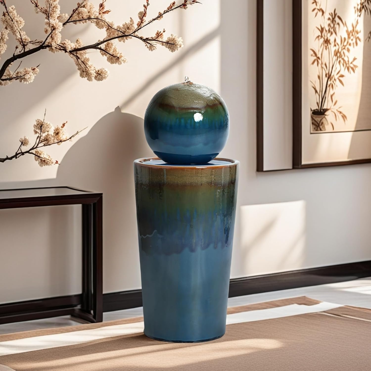 LuxenHome 30" Water Fountain Outdoor and Indoor, Glazed Blue Bubbling Sphere Ceramic Garden Outdoor Water Fountain, Elegant Modern Waterfall Garden Decor for Patio, Lawn, and Backyard