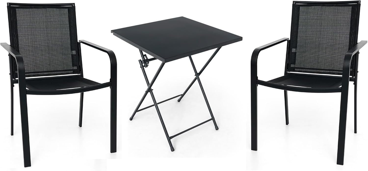 3-Piece Outdoor Bistro Set, 23.5 Folding Table and 2 Stackable Mesh Chairs, Black