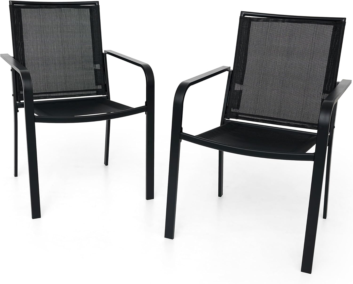 - COMPACT SET: Complete 3-piece bistro set includes one 23.5-inch square folding table and two stackable mesh chairs in sleek black finish