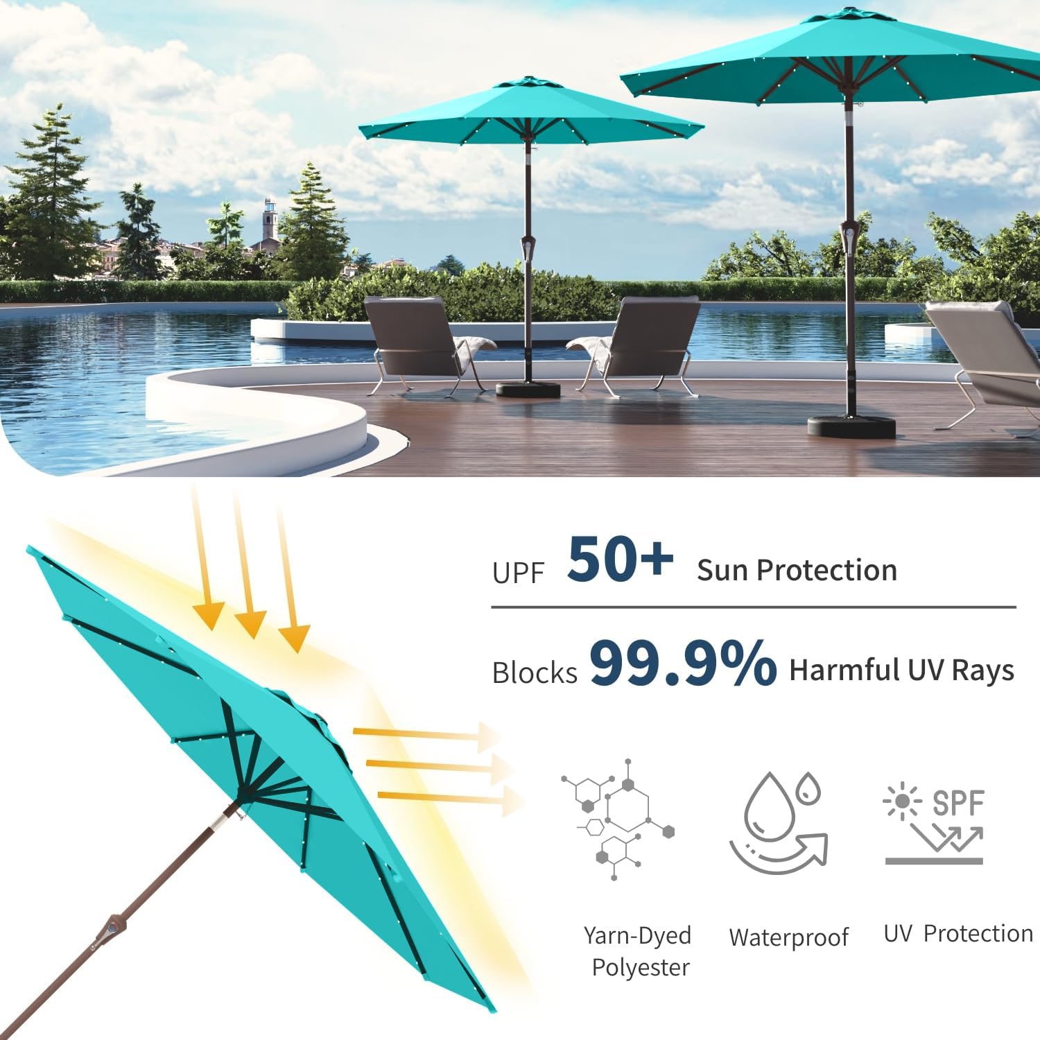 9FT Solar Umbrella 32 LED Lighted Patio Umbrella Table Market Umbrella w/Tilt and Crank, UV-Resistant Outdoor Umbrella for Pool, Garden, Deck, Aqua Blue