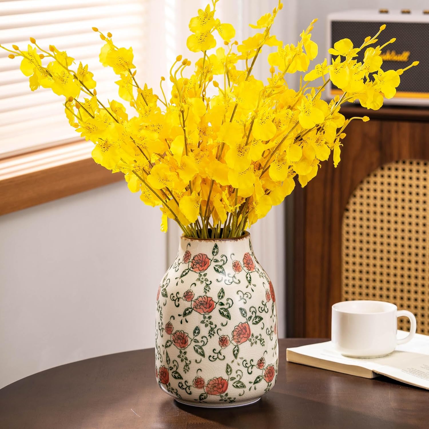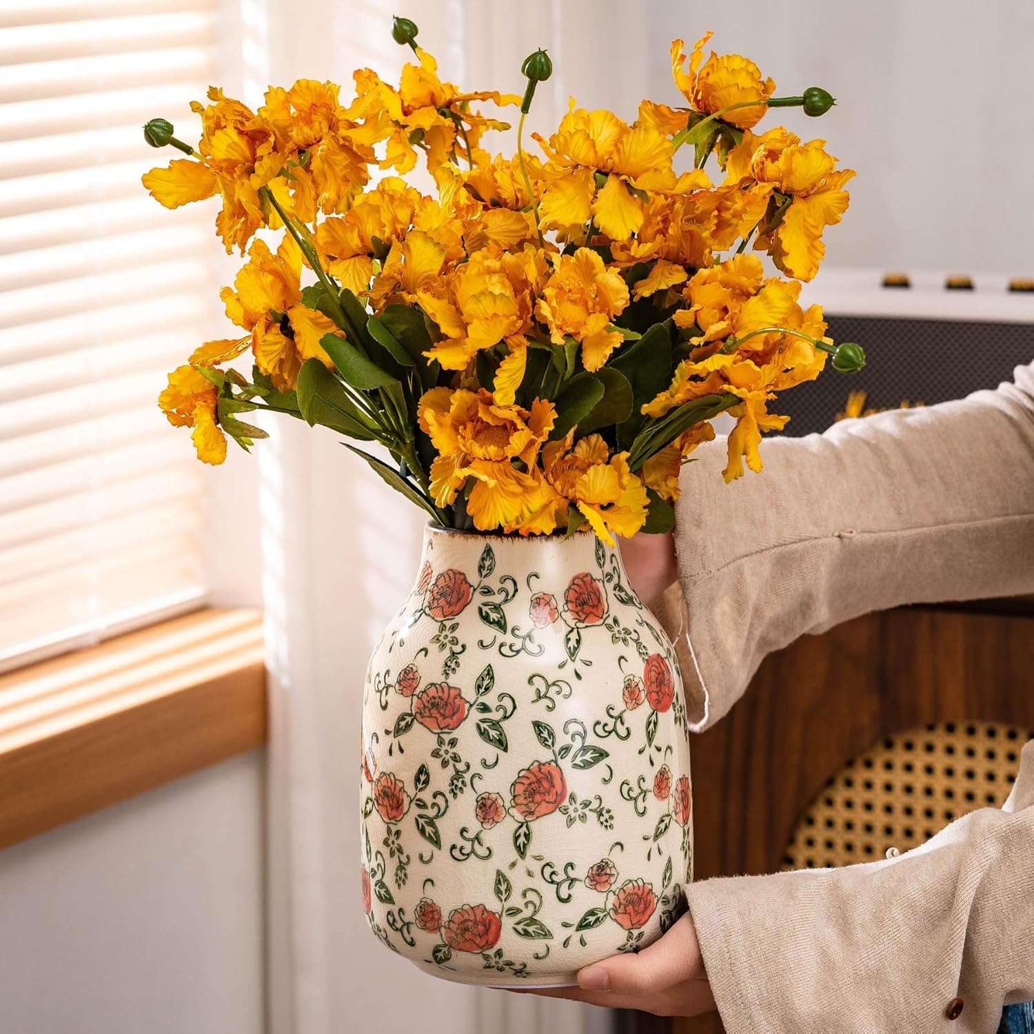 - EXQUISITE HAND-PAINTED DESIGN: The SURE YUESI chinoiserie vase features a stunning hand-painted red rose motif on a green and beige crackle glaze background. Its vintage aesthetic and elegant round shape make it a perfect addition to your chinoiserie decor or grand millennial home style.