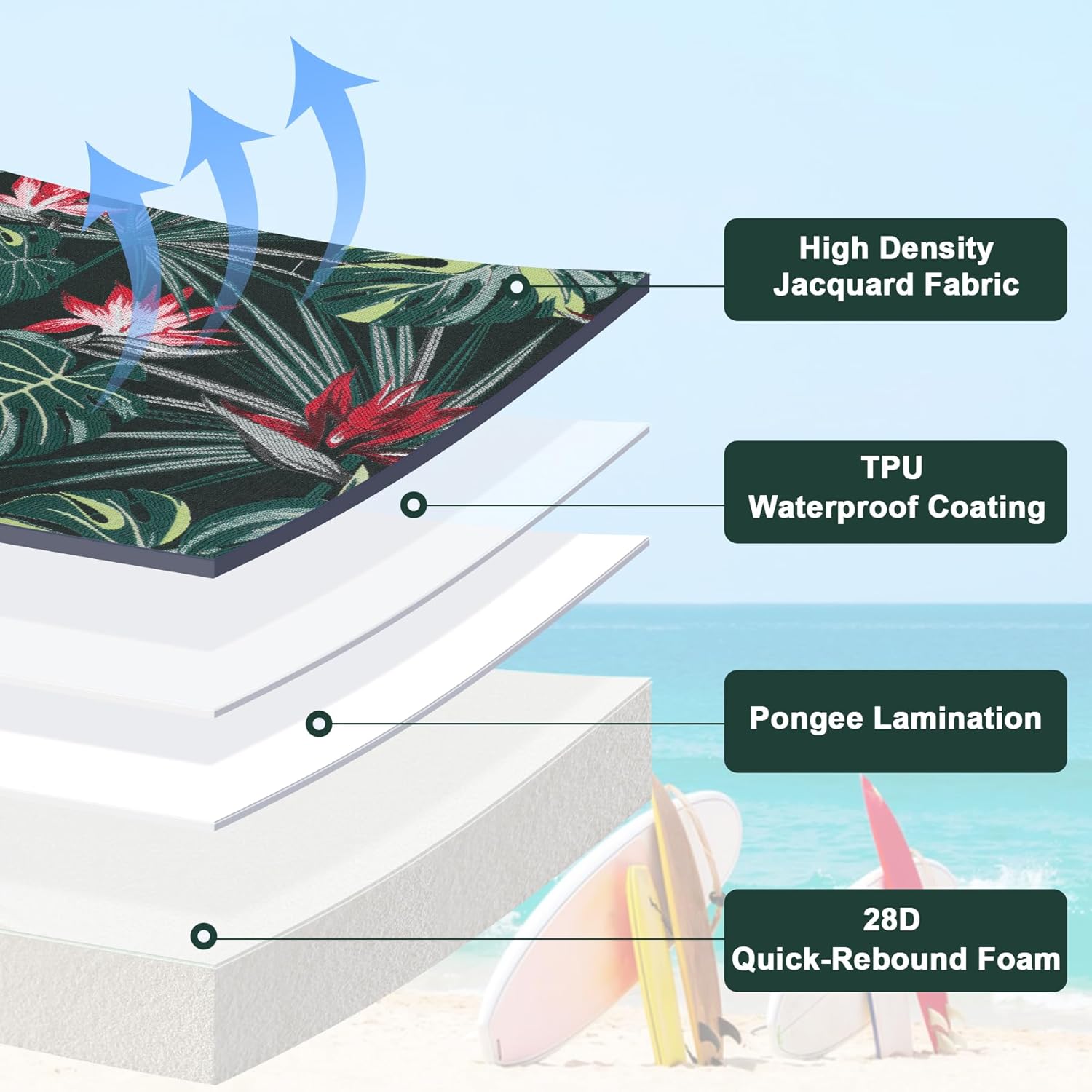 - Fade Resistant - Favoyard patio cushions are dyed using a solution dyeing technique, where the raw material is dyed before weaving to improve color fastness. This technique is also used in the jacquard fabric of the cushion covers, ensuring that the cushions retain their vibrant colors after 1,500 hours in the sun.